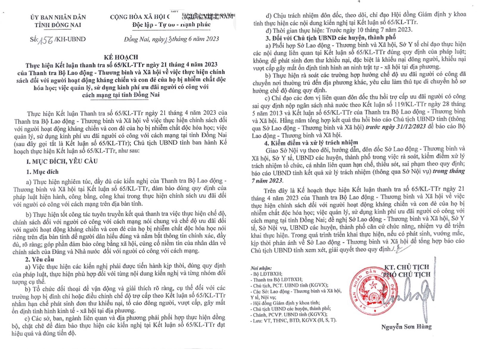 (Thanh tra) - UBND tỉnh Đồng Nai đã ban hành kế hoạch thực hiện Kết luận thanh tra số 65/KL-TTr ngày 21/4/2023 của Thanh tra Bộ Lao động - Thương binh và Xã hội (LĐ-TB&XH) về việc thực hiện chính sách đối với người hoạt động kháng chiến và có con đẻ của họ bị nhiễm chất độc hóa học; việc quản lý, sử dụng kinh phí ưu đãi người có công với cách mạng tỉnh.