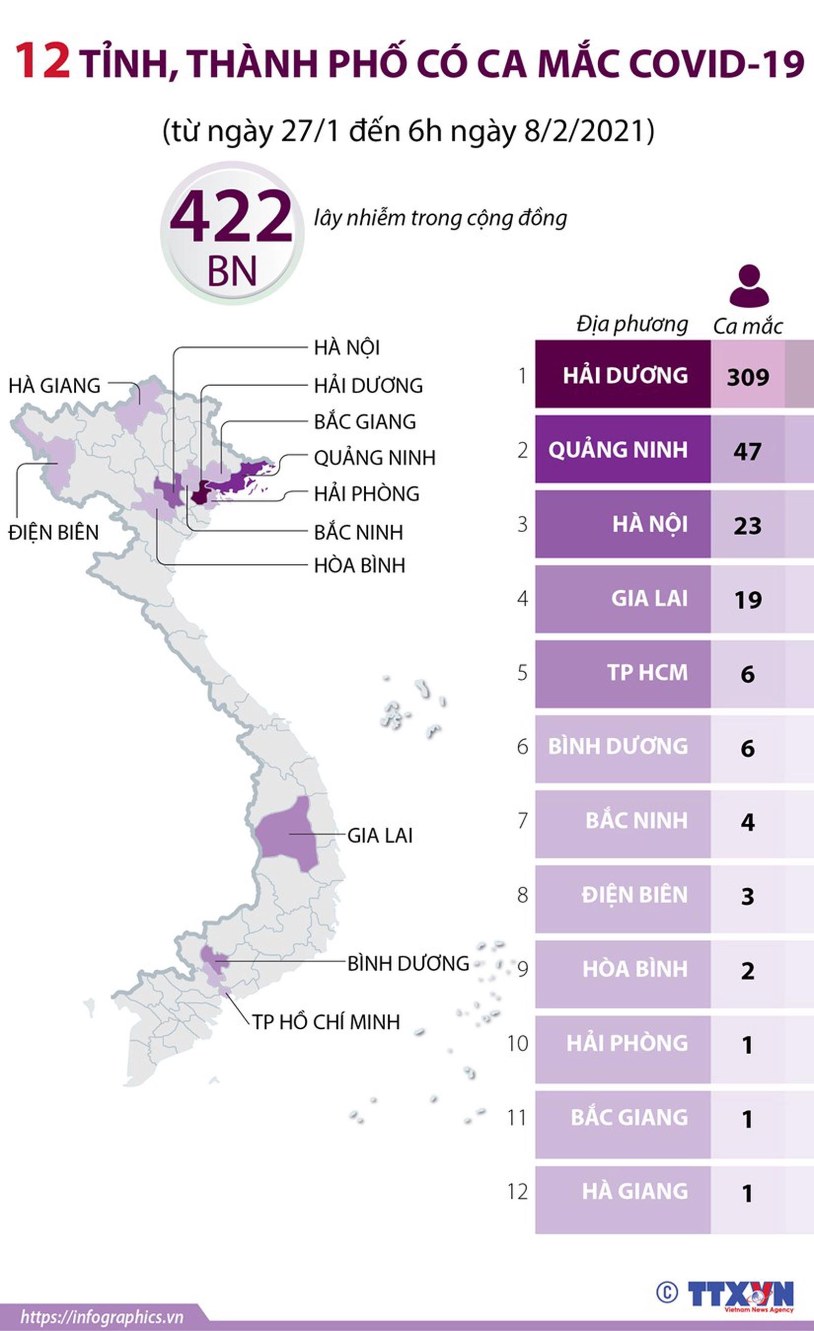 Từ ngày 27/1 đến 6 giờ ngày 8/2/2021, Việt Nam ghi nhận 422 ca mắc mới COVID-19 tại 12 tỉnh, thành phố (không tính các ca nhập cảnh).