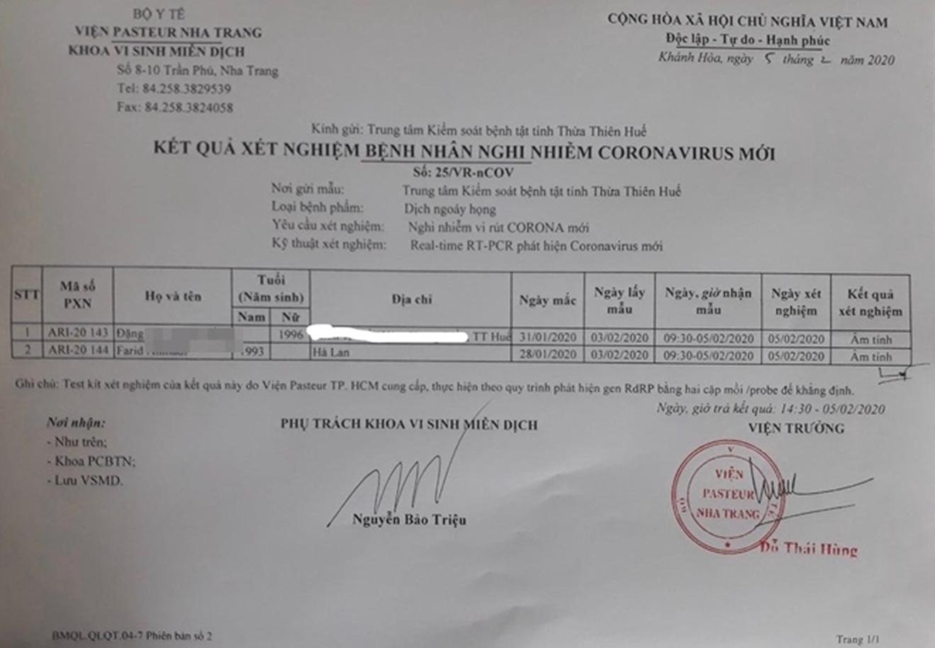 Chiều qua, Viện Pasteur Nha Trang đã gửi kết quả xét nghiệm virus Corona của 6 bệnh nhân nói trên. Kết quả cho thấy 5/6 trường hợp đều âm tính với virus Corona (nCoV). Trường hợp thứ 6 là cháu của một bệnh nhân đã có kết quả âm tính và sẽ có kết quả của trường hợp này từ Viện Pasteur trong ngày hôm nay 6/2.
