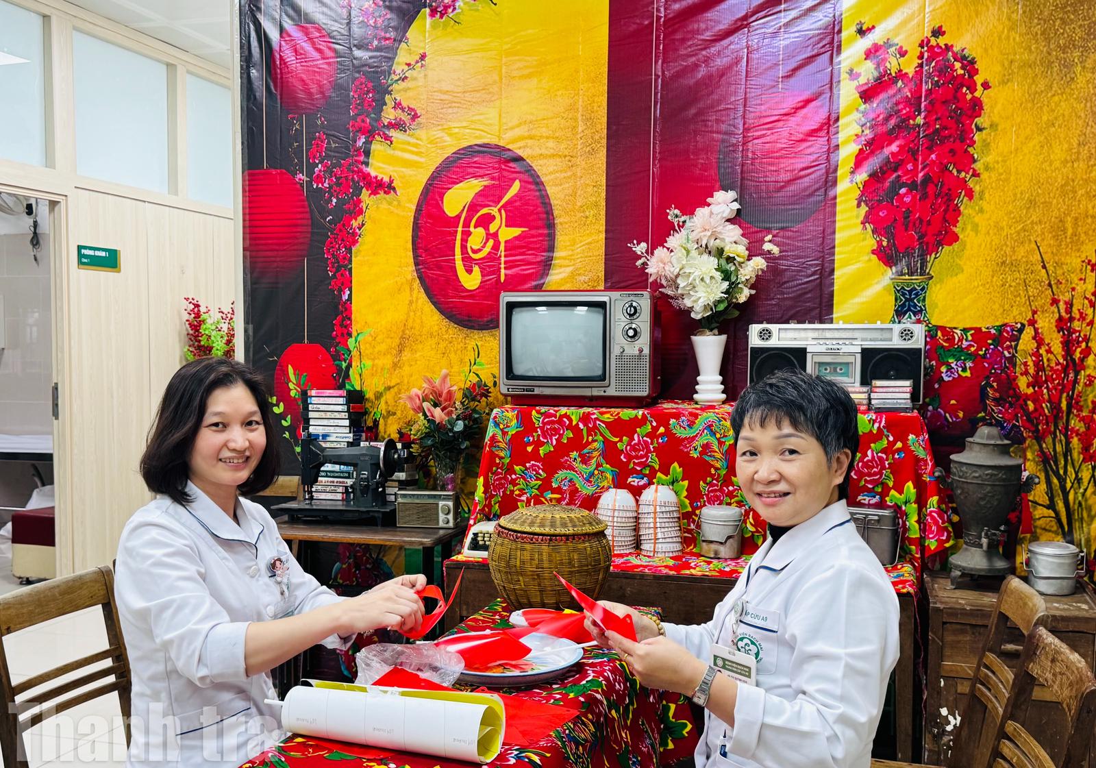 Các bác sĩ đang trang trí không gian Tết ngay tại Trung tâm Cấp cứu A9, Bệnh viện Bạch Mai để chuẩn bị cho y, bác sĩ và bệnh nhân ở lại bệnh viện đón Tết. Ảnh: Thanh Lương