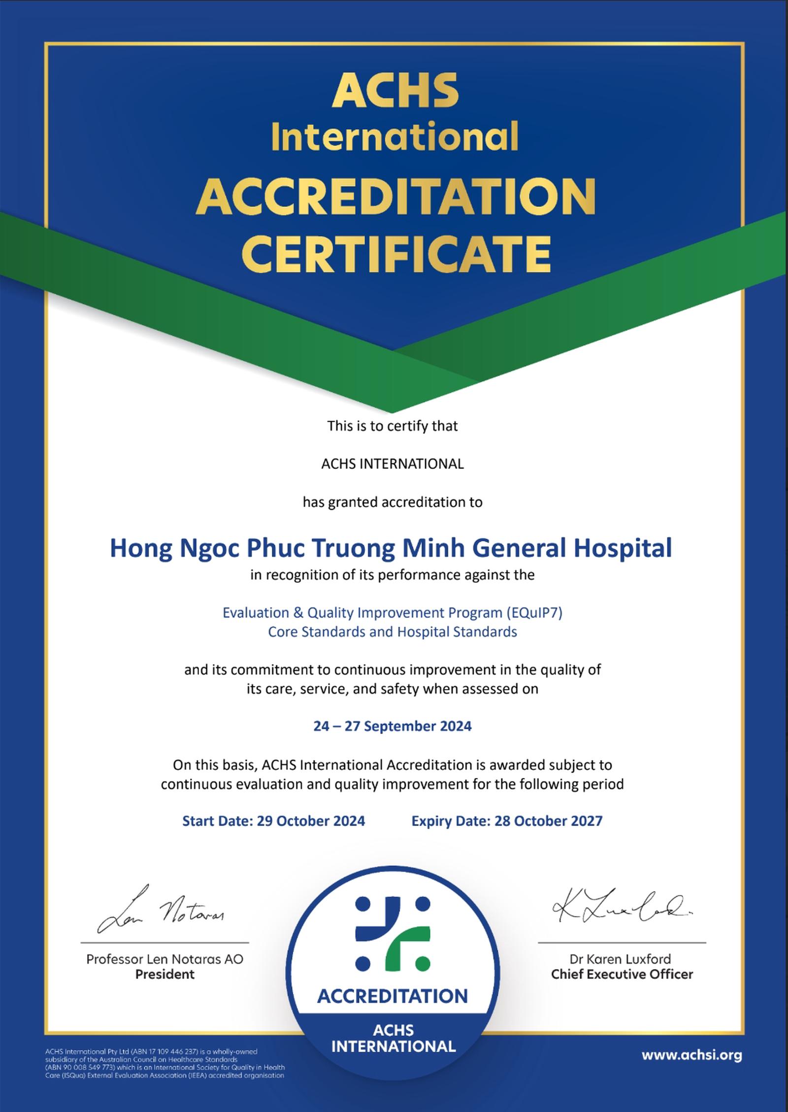 Với yêu cầu khắt khe từ một trong những tổ chức đánh giá chất lượng y tế hàng đầu thế giới, Bệnh viện Đa khoa Hồng Ngọc sẽ phải trải qua các kỳ đánh giá thường niên của ACHS để duy trì hiệu lực chứng chỉ, đảm bảo những cam kết chất lượng luôn được duy trì ở mức cao nhất với người bệnh.