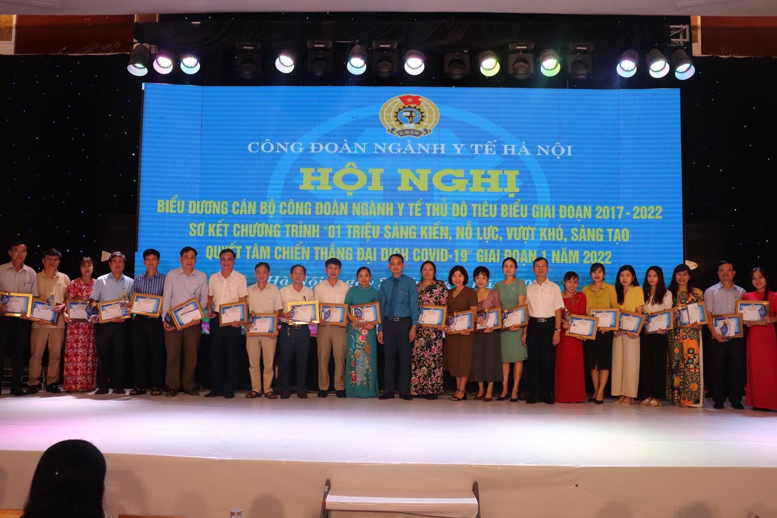 LĐ Sở Y tế và LĐLĐ TP tặng Giấy công nhận, biểu trưng pha lê cho 212 cán bộ Công đoàn ngành y tế Thủ đô tiêu biểu giai đoạn 2017-2022. Ảnh: Văn Lập