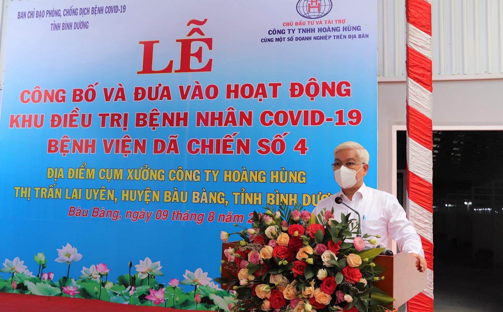 Thay mặt Đảng bộ, chính quyền và nhân dân tỉnh Bình Dương, Bí thư Tỉnh ủy Bình Dương Nguyễn Văn Lợi gửi lời cám ơn sâu sắc tới Công ty TNHH Hoàng Hùng và lãnh đạo các doanh nghiệp đã chung tay hỗ trợ tỉnh xây dựng thần tốc Bệnh viện Dã chiến số 4; đồng thời, kêu gọi toàn thể hệ thống chính trị, các tổ chức, doanh nghiệp và người dân chung tay phòng, chống và đẩy lùi dịch bệnh.