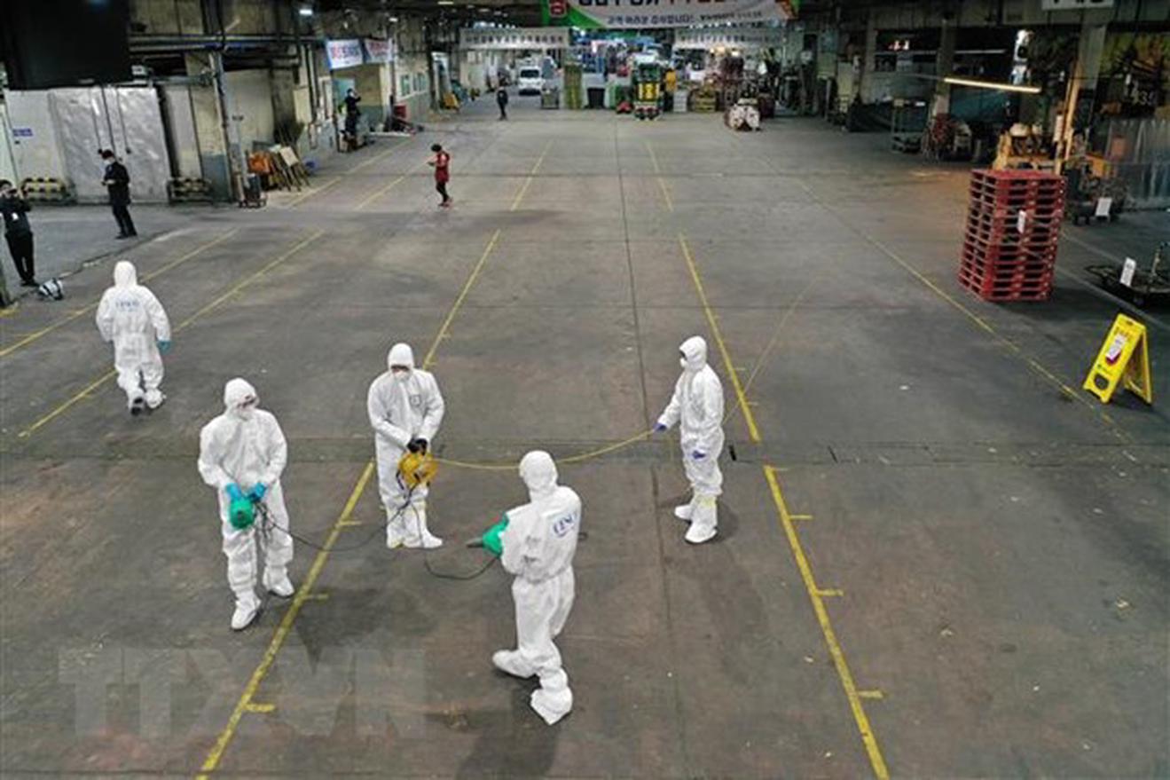 Phun thuốc khử trùng tại một chợ rau củ ở thành phố Daegu, Hàn Quốc nhằm ngăn chặn sự lây lan của dịch COVID-19, ngày 20/2/2020. (Ảnh: AFP/TTXVN)