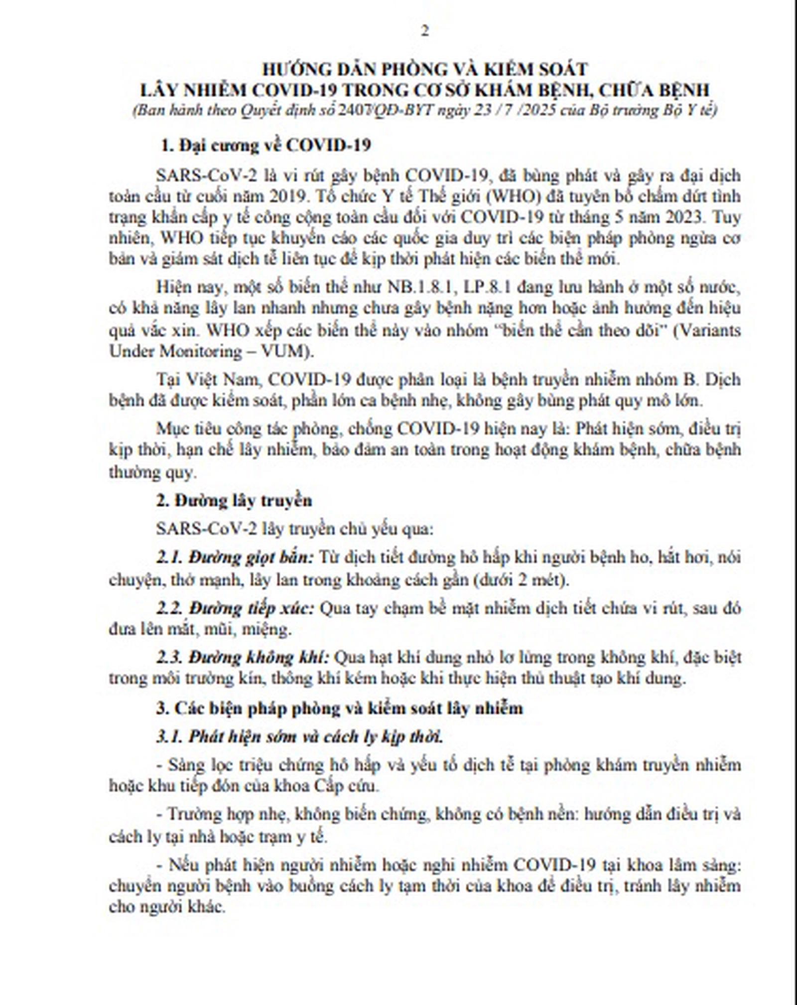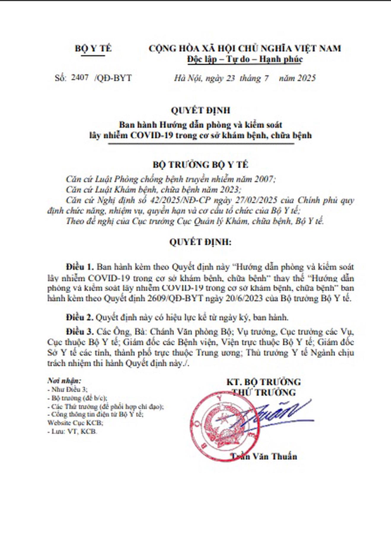 “Hướng dẫn phòng và kiểm soát lây nhiễm COVID-19 trong cơ sở khám bệnh, chữa bệnh” ban hành theo Quyết định số 2407 /QĐ-BYT ngày 23/7/2025 của Bộ trưởng Bộ Y tế thay thế “Hướng dẫn phòng và kiểm soát lây nhiễm COVID-19 trong cơ sở khám bệnh, chữa bệnh” ban hành kèm theo Quyết định 2609/QĐ-BYT ngày 20/6/2023 của Bộ trưởng Bộ Y tế.