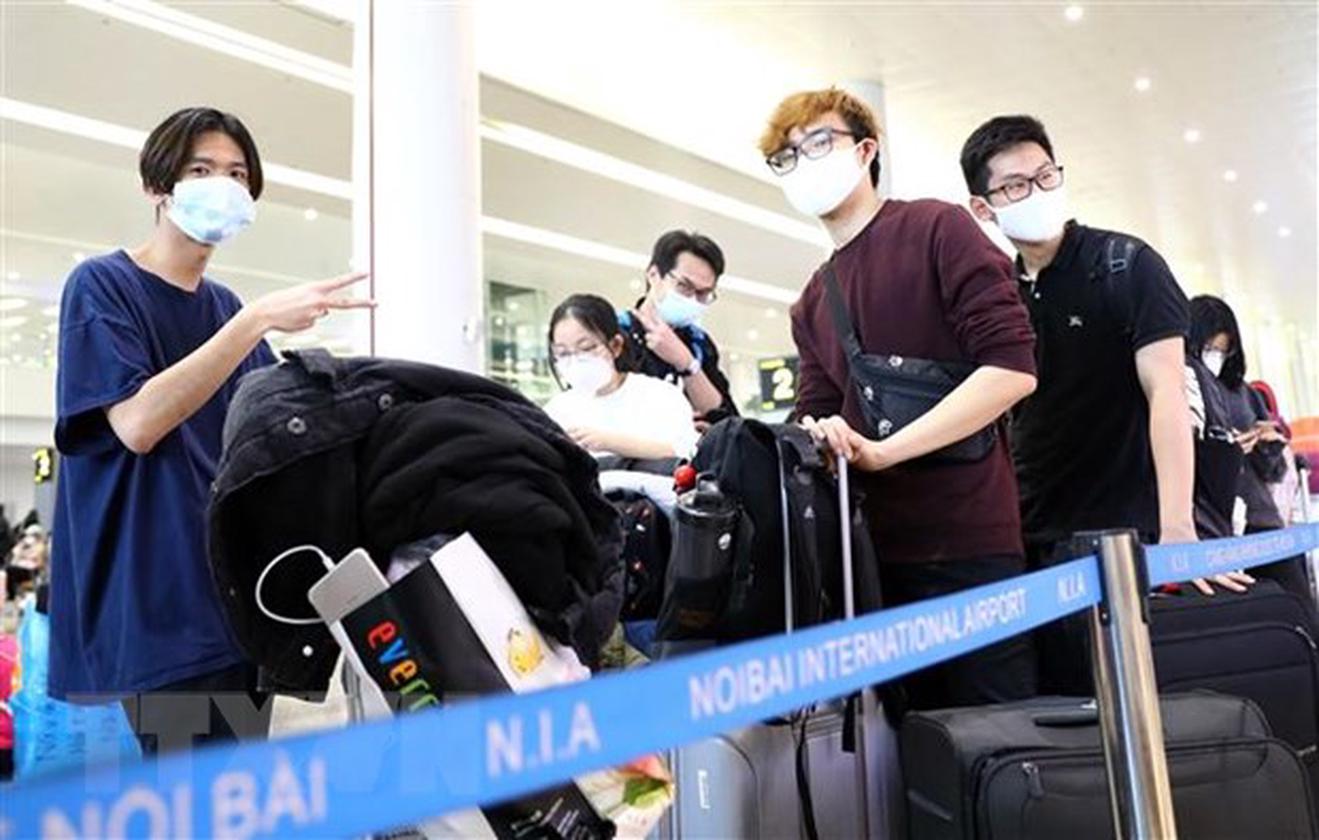 Du học sinh trở về từ châu Âu chờ di chuyển đến nơi cách ly tập trung. (Ảnh: Huy Hùng/TTXVN)