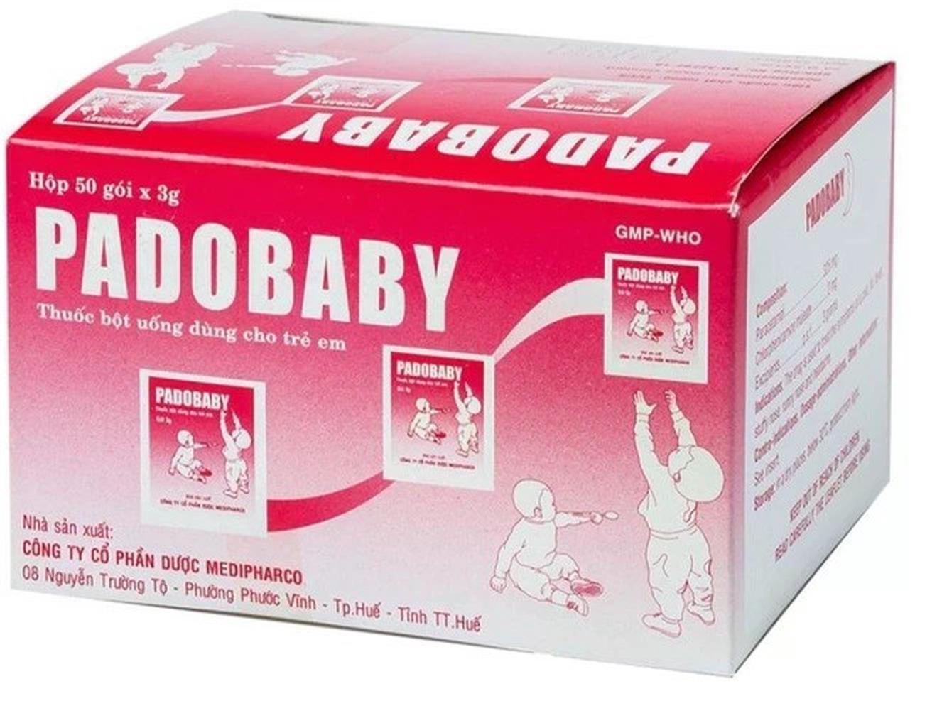 Padobaby là thuốc bột uống đóng gói 3g, chứa hoạt chất paracetamol (325mg) và chlorpheniramin maleat (2mg). Thuốc thường dùng để giảm đau, hạ sốt, điều trị các triệu chứng cảm cúm, dị ứng cho trẻ em từ 2 tuổi và người lớn.