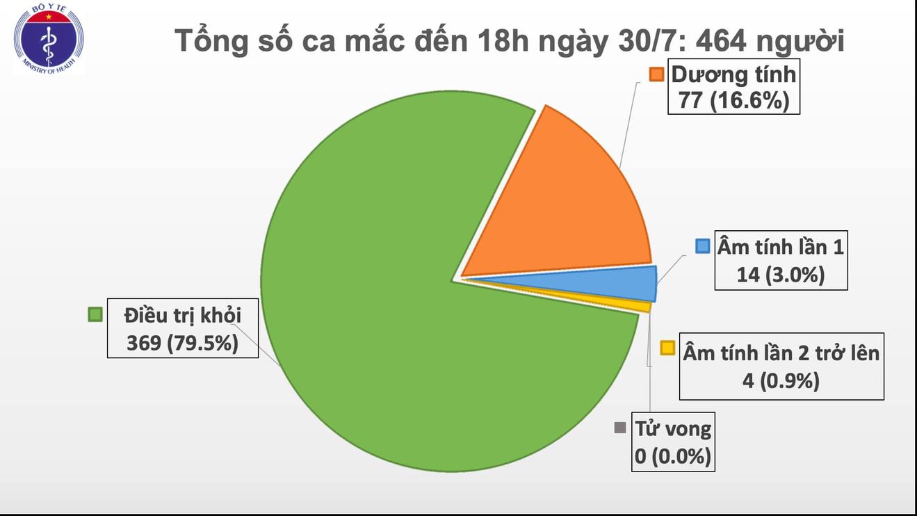 Như vậy, đến 18 giờ ngày 30/7, Việt Nam có tổng cộng 464 ca mắc COVID-19, trong đó 276 ca nhiễm nhập cảnh được cách ly ngay.