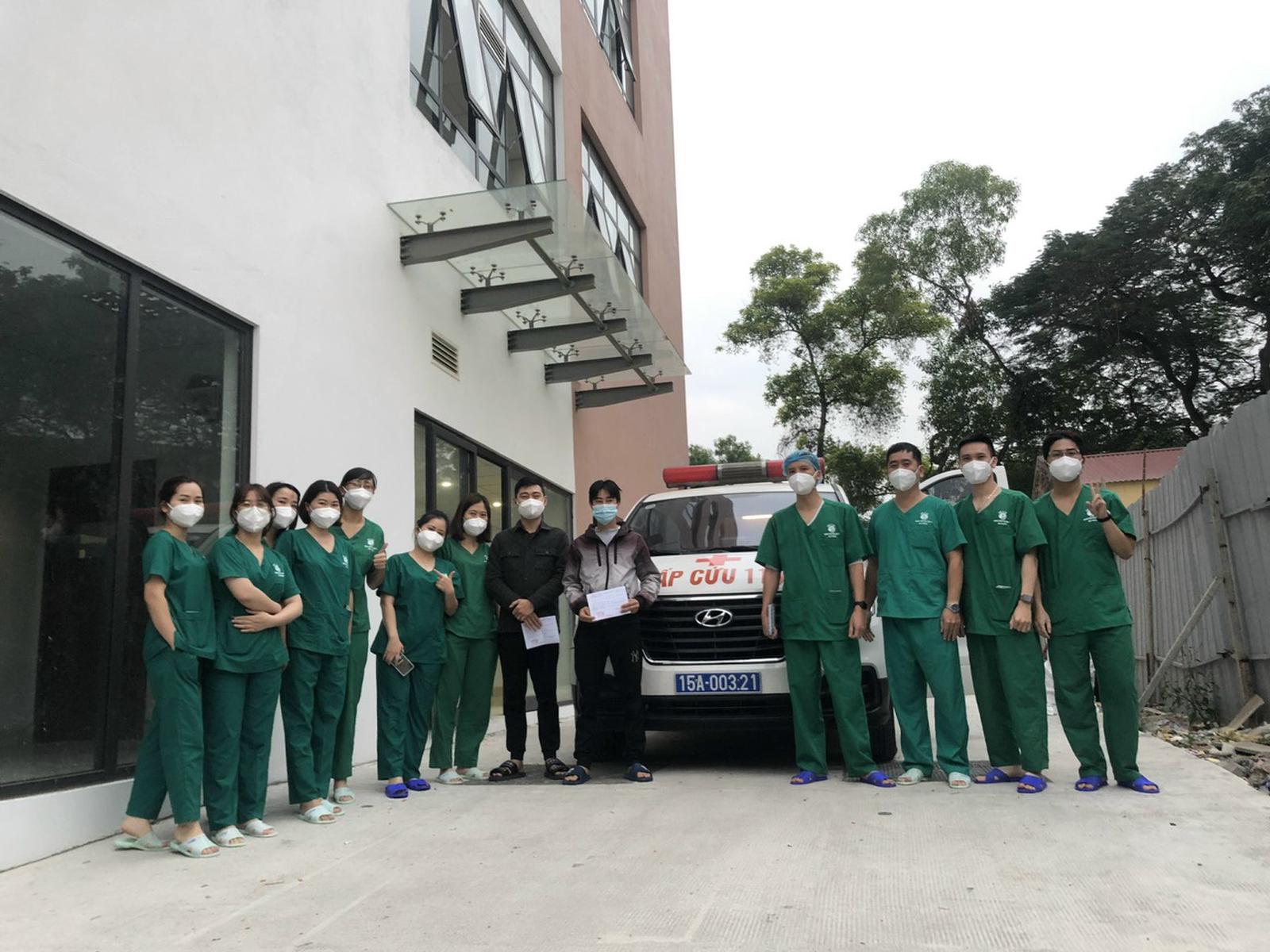 Các Y, Bác sĩ của Bệnh viện Y Dược Hải Phòng chụp ảnh cùng bệnh nhân COVI-19 khỏi bệnh về nhà cách ly y tế. Ảnh Quang Trung
