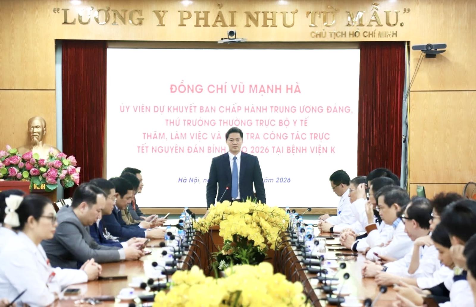 Thứ trưởng Thường trực Bộ Y tế Vũ Mạnh Hà đã làm việc và kiểm tra công tác trực Tết Nguyên đán Bính Ngọ 2026 tại Bệnh viện K. Ảnh: T.T