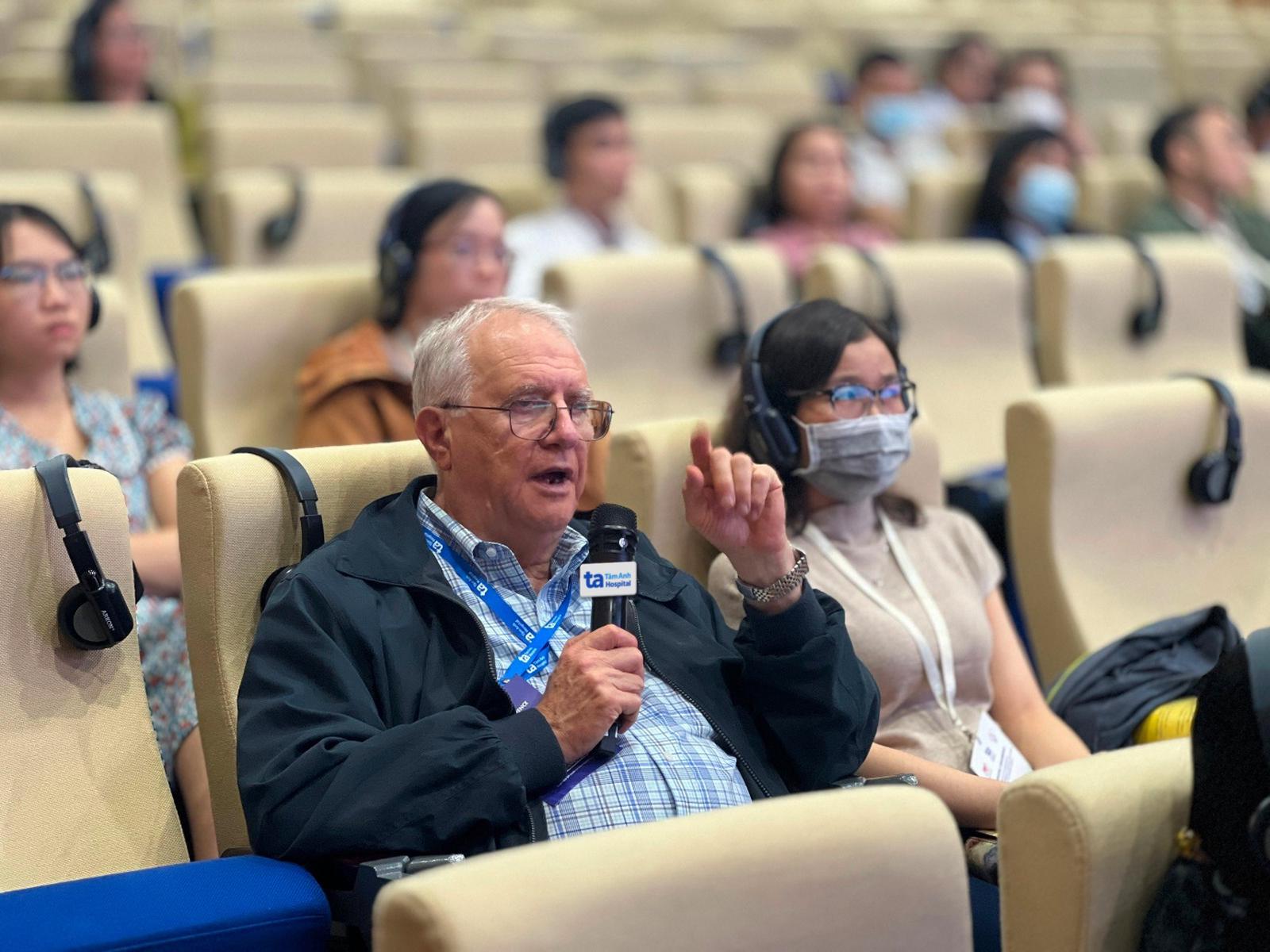 Giáo sư Norman Henry Silverman - chuyên gia siêu âm tim nhi và tim thai đến từ Mỹ trao đổi cùng các bác sĩ tại hội nghị.