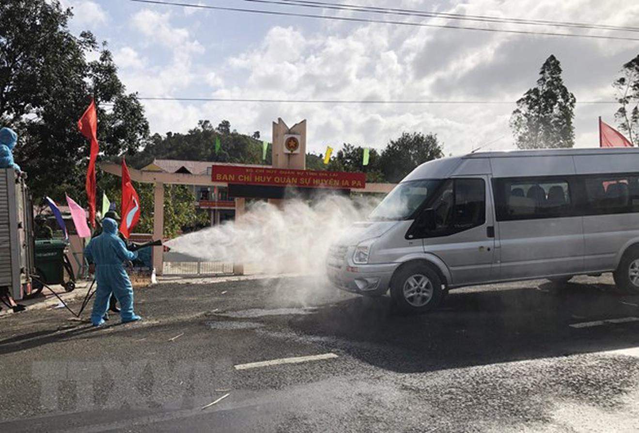 Phun dung dịch khử khuẩn tại thị xã Ayun Pa và Ia Pa. (Ảnh: Quang Thái/TTXVN)