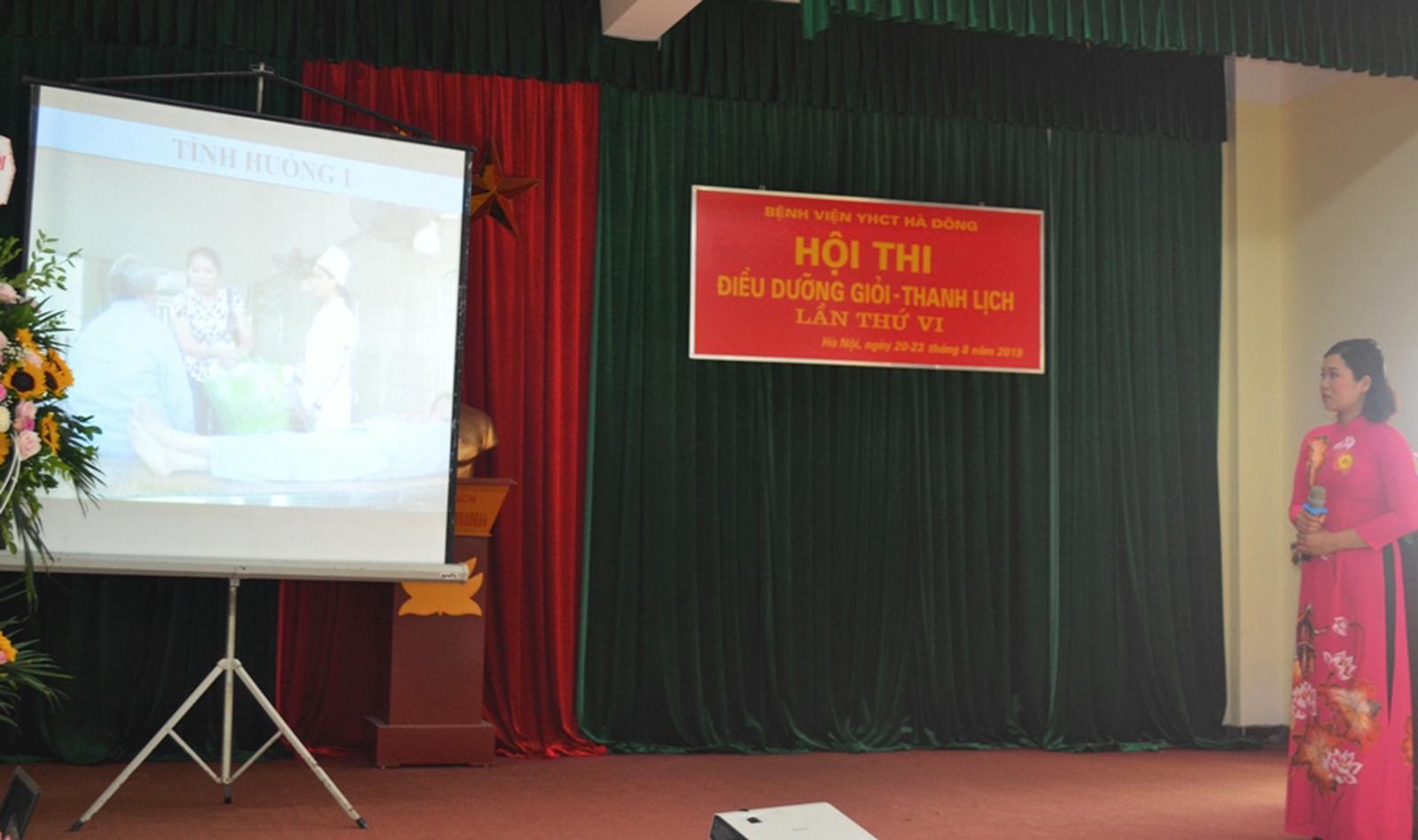 Phát biểu khai mạc hội thi, Thầy thuốc Ưu tú, ThS.BSCKII Vũ Văn Hoàng, Giám đốc Bệnh viện Y học cổ truyền Hà Đông cho biết, nhiệm vụ của điều dưỡng chiếm vị trí quan trọng trong chăm sóc sức khỏe người bệnh. Ngoài việc thực hiện nghiêm túc chỉ định điều trị và quy trình kỹ thuật chuyên môn, điều dưỡng còn là người chủ động lập kế hoạch chăm sóc người bệnh; sát sao theo dõi, báo cáo kịp thời các triệu chứng bất thường của người bệnh; tư vấn, hỗ trợ, giáo dục sức khỏe, chăm sóc cả thể chất và tinh thần cho người bệnh. Đồng thời linh hoạt, kịp thời xử lý các tình huống xảy ra nhằm bảo đảm an toàn người bệnh.
