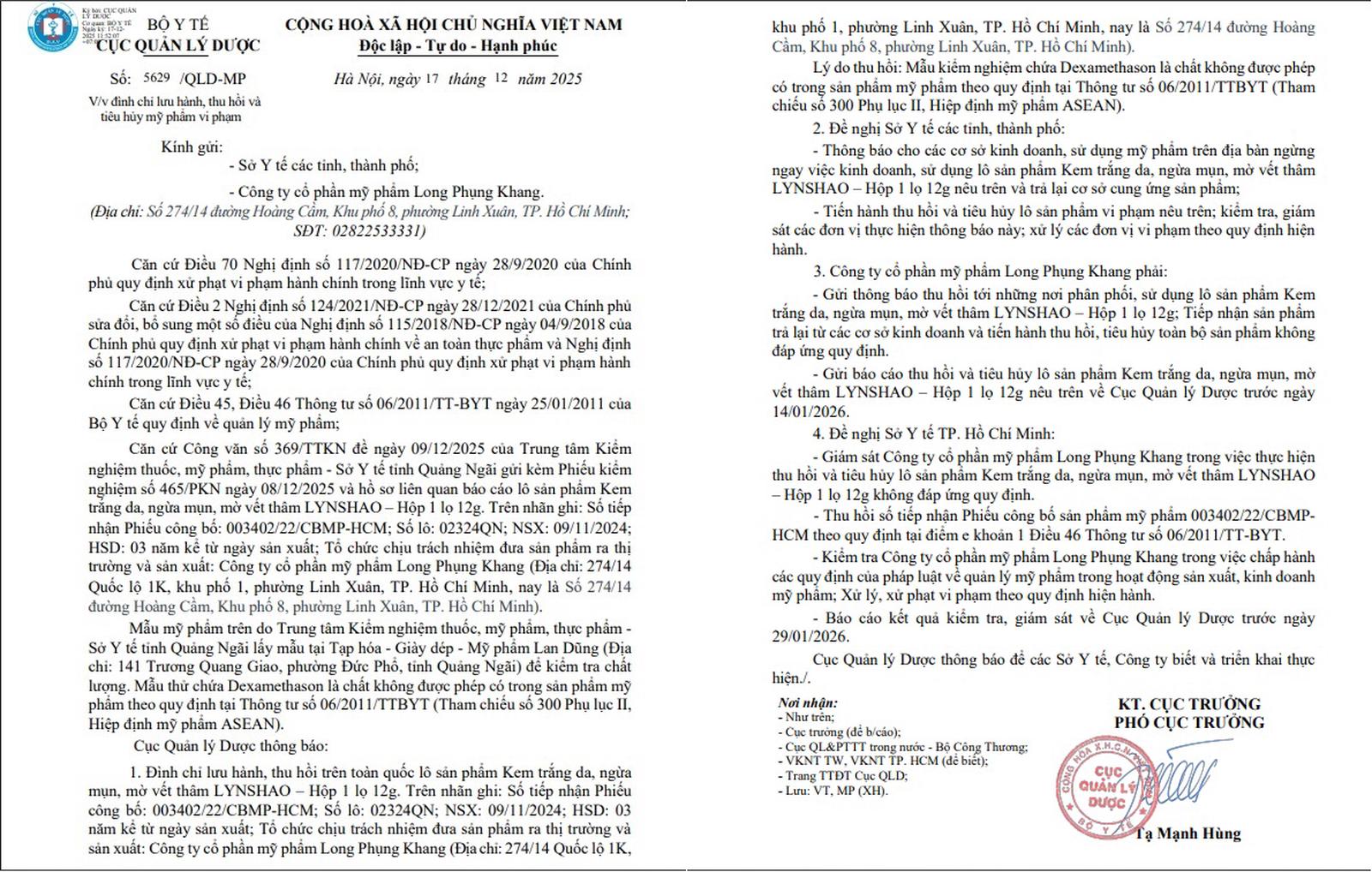 Công ty Cổ phần Mỹ phẩm Long Phụng Khang có trách nhiệm gửi thông báo thu hồi tới các đơn vị phân phối, sử dụng sản phẩm; tiếp nhận sản phẩm trả lại và tổ chức thu hồi, tiêu hủy toàn bộ lô sản phẩm không đáp ứng quy định. Doanh nghiệp phải báo cáo kết quả thu hồi, tiêu hủy về Cục Quản lý Dược trước ngày 14/1/2026.