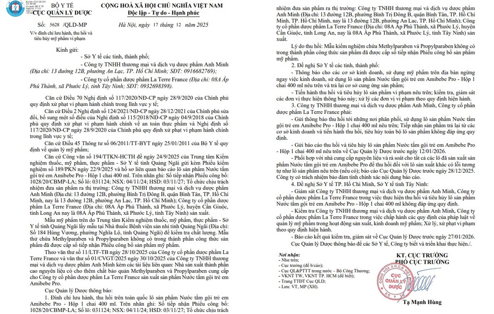 Ngoài ra, các doanh nghiệp liên quan có trách nhiệm phối hợp với nhà cung cấp nguyên liệu, rà soát các lô sản phẩm Amibebe Pro đã sản xuất để thu hồi các lô khác có lỗi tương tự (nếu có), báo cáo Cục Quản lý Dược trước ngày 28/12/2025, bảo đảm tính chính xác của nội dung báo cáo.