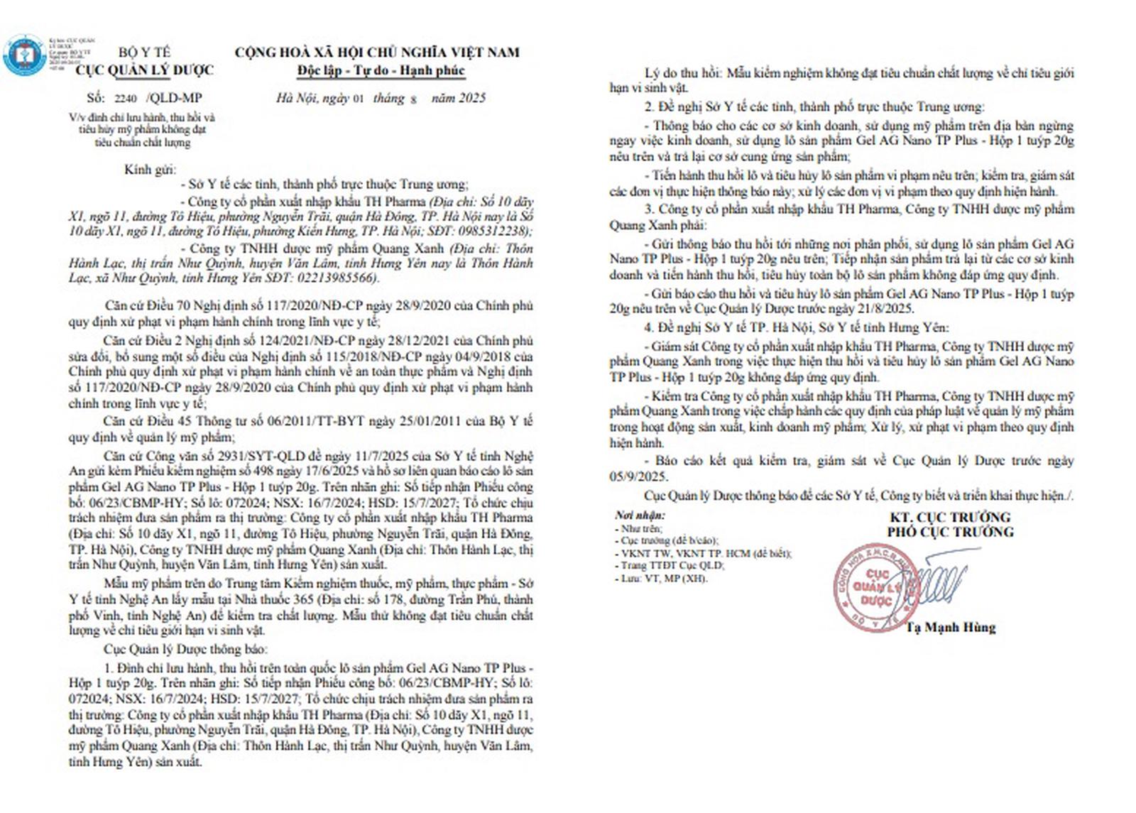 Cục Quản lý Dược cũng đề nghị Sở Y tế TP Hà Nội và Sở Y tế tỉnh Hưng Yên giám sát Công ty Cổ phần Xuất nhập khẩu TH Pharma và Công ty TNHH Dược Mỹ phẩm Quang Xanh trong việc thực hiện thu hồi và tiêu hủy lô sản phẩm Gel AG Nano TP Plus. Hai Sở Y tế này cũng cần kiểm tra các công ty về việc chấp hành các quy định của pháp luật về quản lý mỹ phẩm, xử lý các vi phạm và báo cáo kết quả kiểm tra, giám sát về Cục Quản lý Dược trước ngày 5/9/2025.