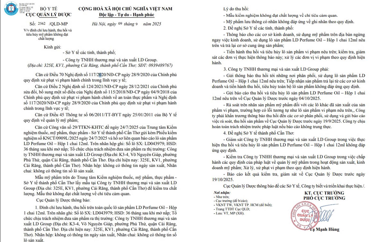 Gửi báo cáo thu hồi và tiêu hủy lô sản phẩm Dung dịch vệ sinh phụ nữ Ori Women Pluss - Hộp 1 chai 120 ml và lô sản phẩm LD Perfume Oil – Hộp 1 chai 12m về Cục Quản lý Dược trước ngày 4/10/2025.