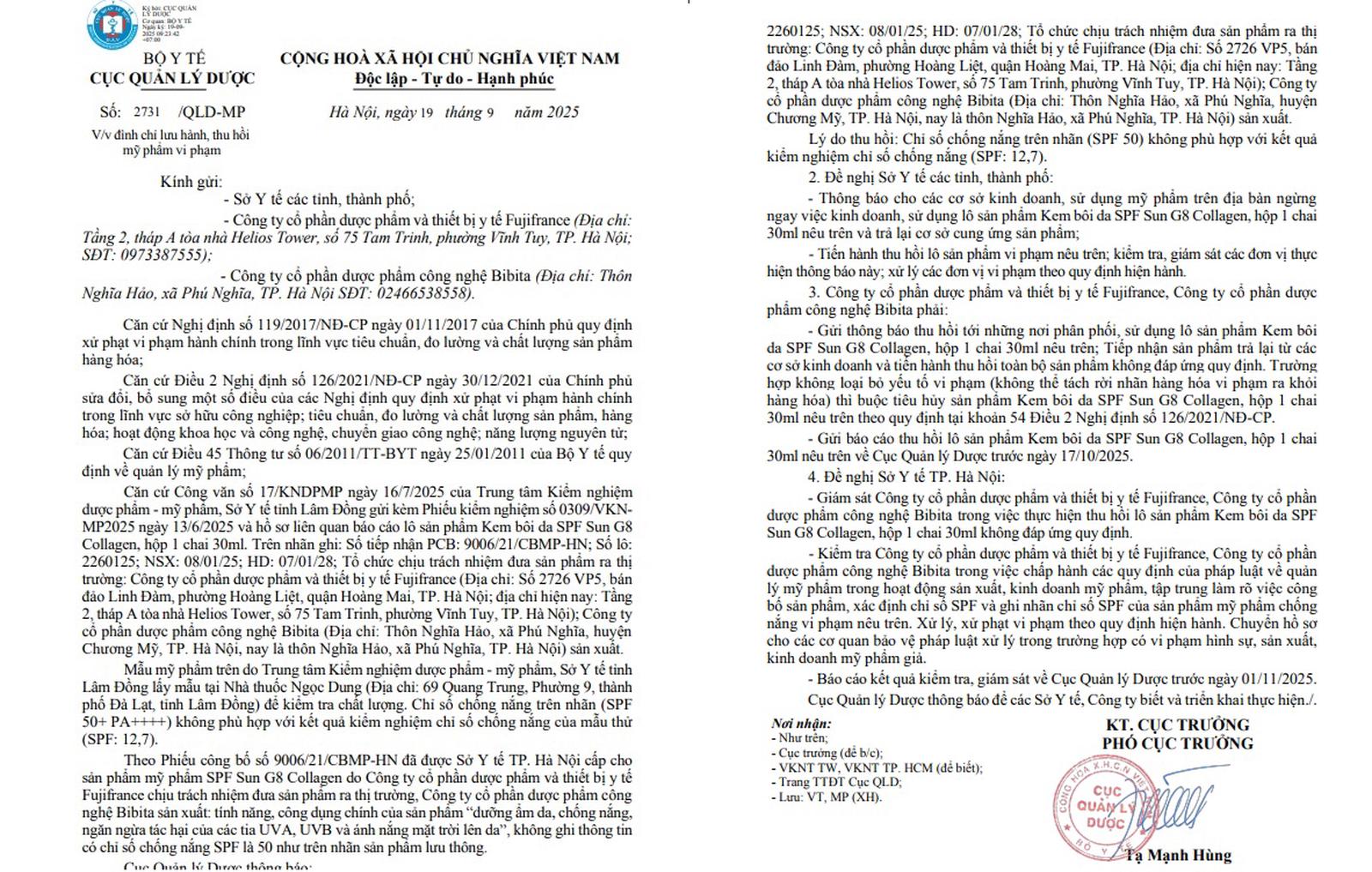 Đề nghị Sở Y tế TP Hà Nội giám sát Công ty Cổ phần Dược phẩm và Thiết bị y tế Fujifrance, Công ty Cổ phần Dược phẩm công nghệ Bibita trong việc thực hiện thu hồi lô sản phẩm Kem bôi da SPF Sun G8 Collagen, hộp 1 chai 30ml không đáp ứng quy định.