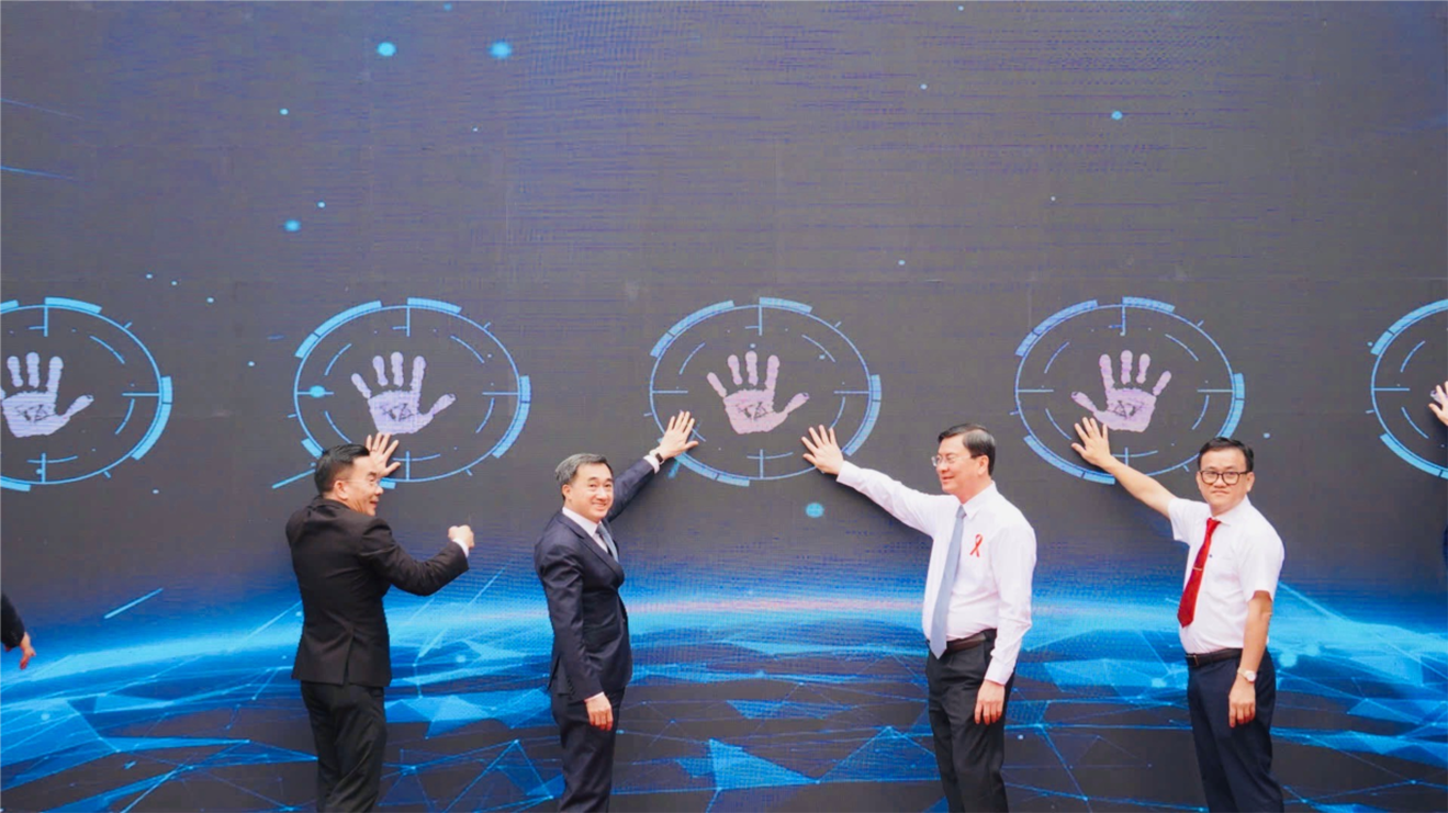 Lãnh đạo thực hiện nghi thức ấn nút hưởng ứng, cam kết đồng hành chấm dứt đại dịch AIDS tại Việt Nam vào năm 2030. Ảnh: Bình An