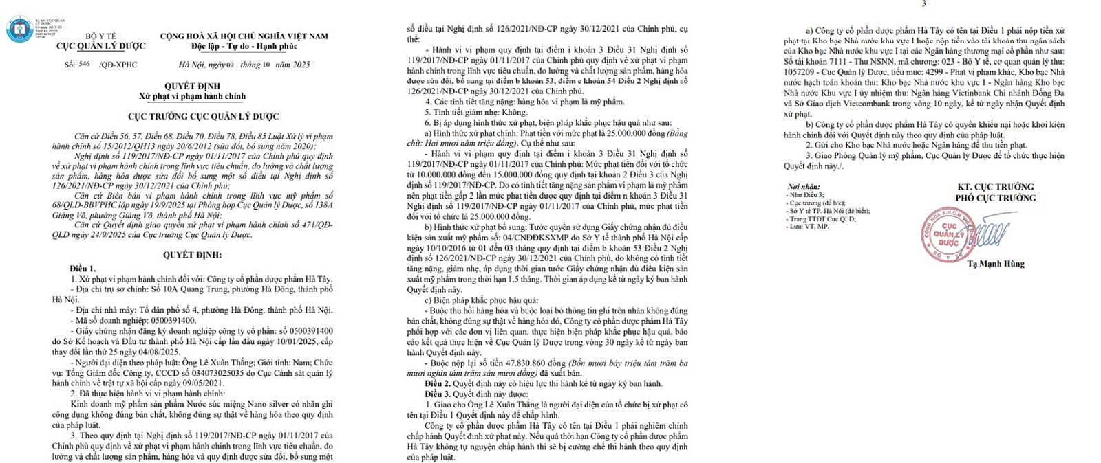 (Thanh tra) - Cục Quản lý Dược (Bộ Y tế) vừa ban hành Quyết định số 546/QĐ-XPHC về việc xử phạt vi phạm hành chính đối với Công ty cổ phần Dược phẩm Hà Tây do kinh doanh sản phẩm Nước súc miệng Nano silver có nhãn ghi công dụng không đúng bản chất, không đúng sự thật về hàng hóa theo quy định pháp luật.