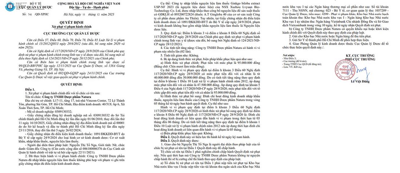 Cục Quản lý Dược quyết định xử phạt Dược phẩm Natura. Ảnh: Cục Quản lý Dược
