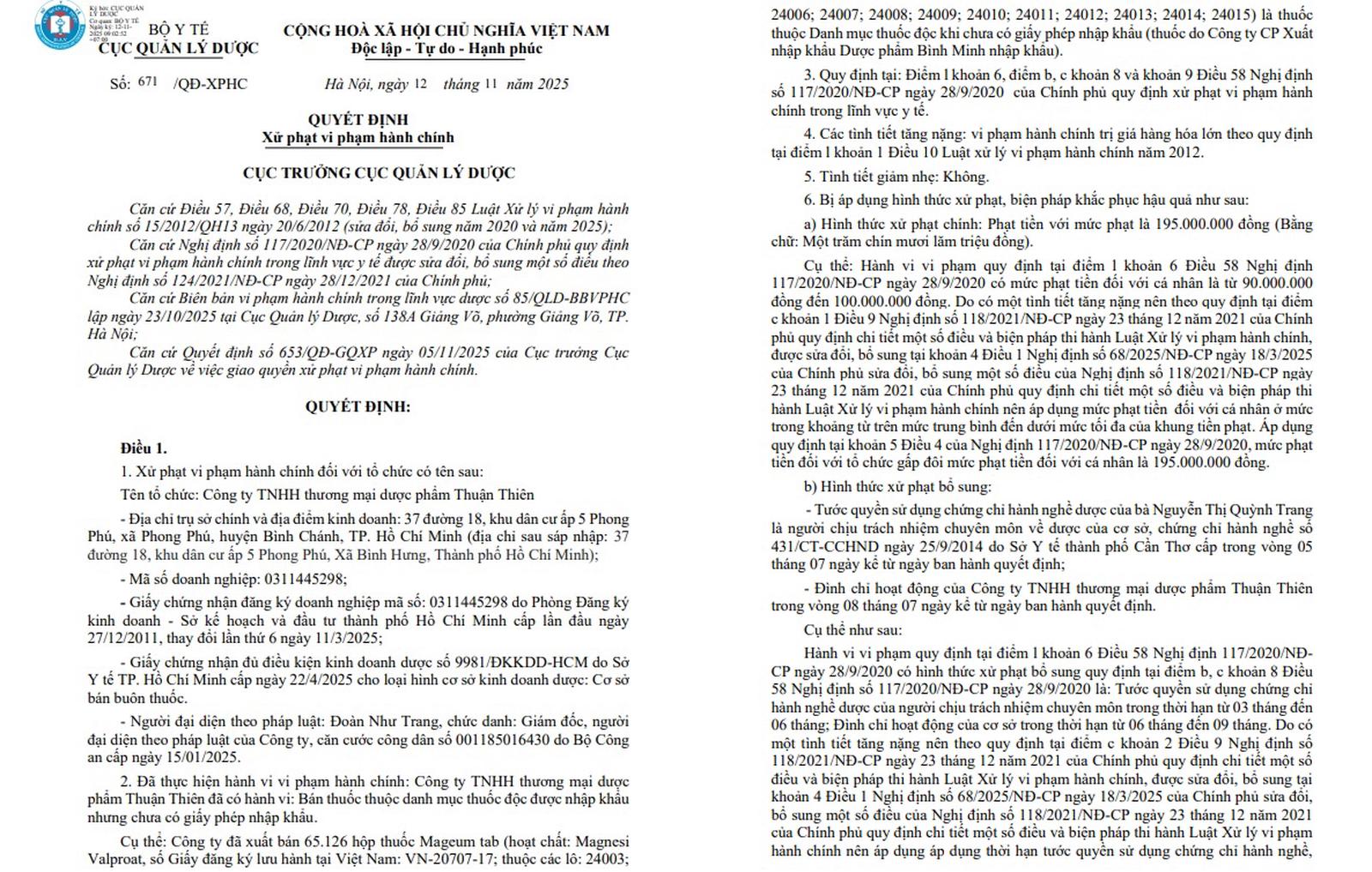 Quyết định xử phạt của Cục Quản lý Dược đối với dược phẩm Thuận Thiên. Ảnh: Cục Quản lý Dược