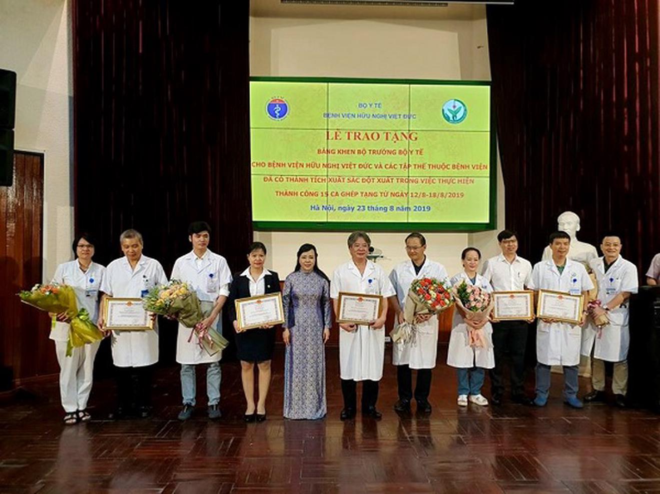 Bộ trưởng Bộ Y tế Nguyễn Thị Kim Tiến trao bằng khen cho Bệnh viện Việt Đức trong việc thực hiện thành công 15 ca ghép tạng từ ngày 12/8-18/8/2019. Ảnh: P.A