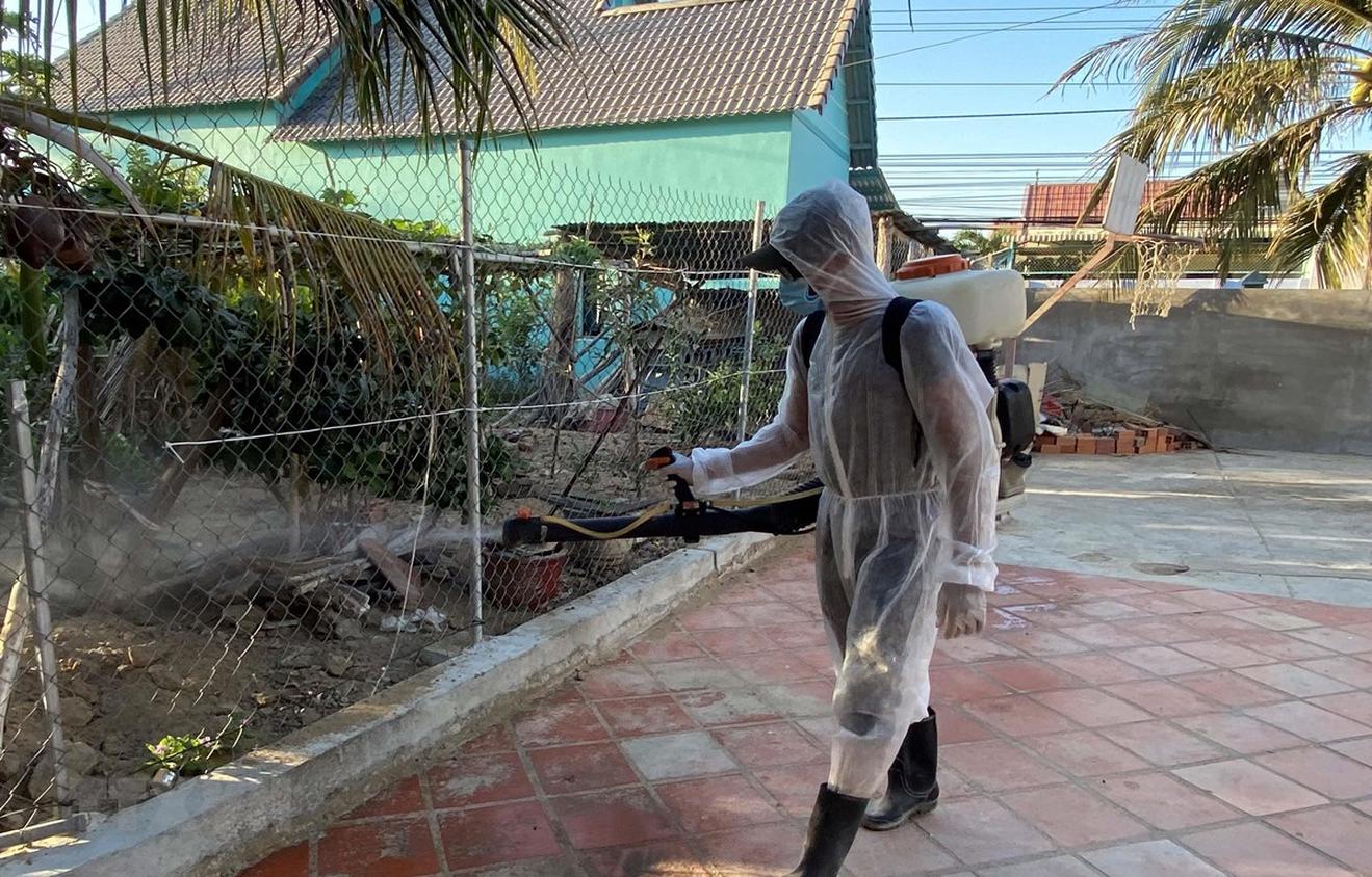 Nhân viên y tế phun thuốc tiêu độc khử khuẩn. (Ảnh: Công Thử/TTXVN)