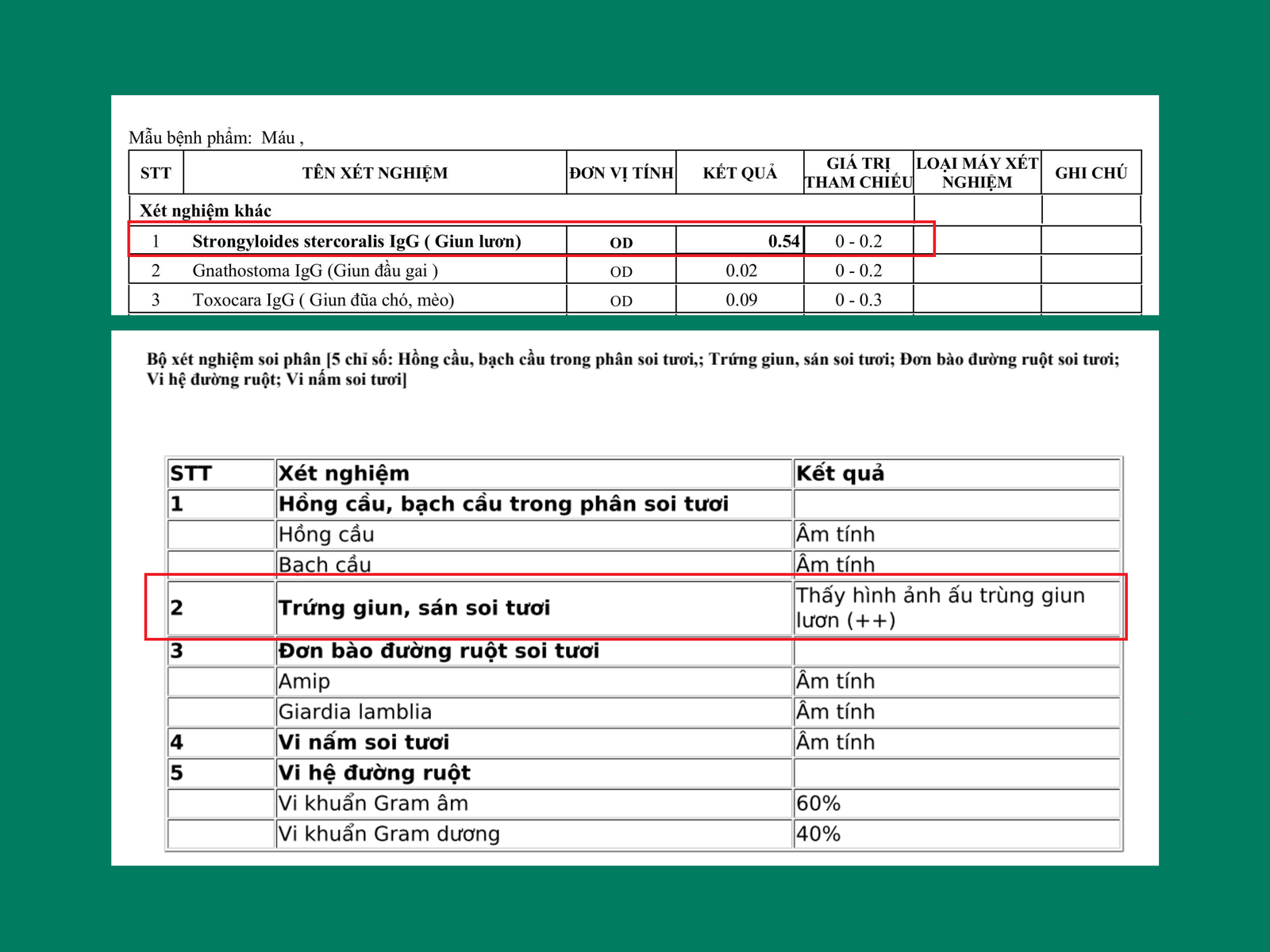Kết quả xét nghiệm máu và phân của bệnh nhân T dương tính với ký sinh trùng giun lươn