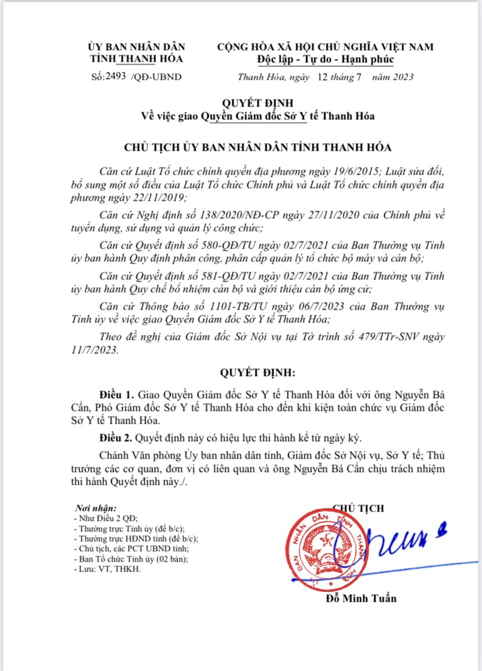 Ngày 12/7, Chủ tịch UBND tỉnh Thanh Hoá đã ký quyết định giao quyền Giám đốc Sở Y tế Thanh Hoá đối với ông Nguyễn Bá Cẩn, Phó Giám đốc cho đến khi kiện toàn chức vụ Giám đốc Sở.