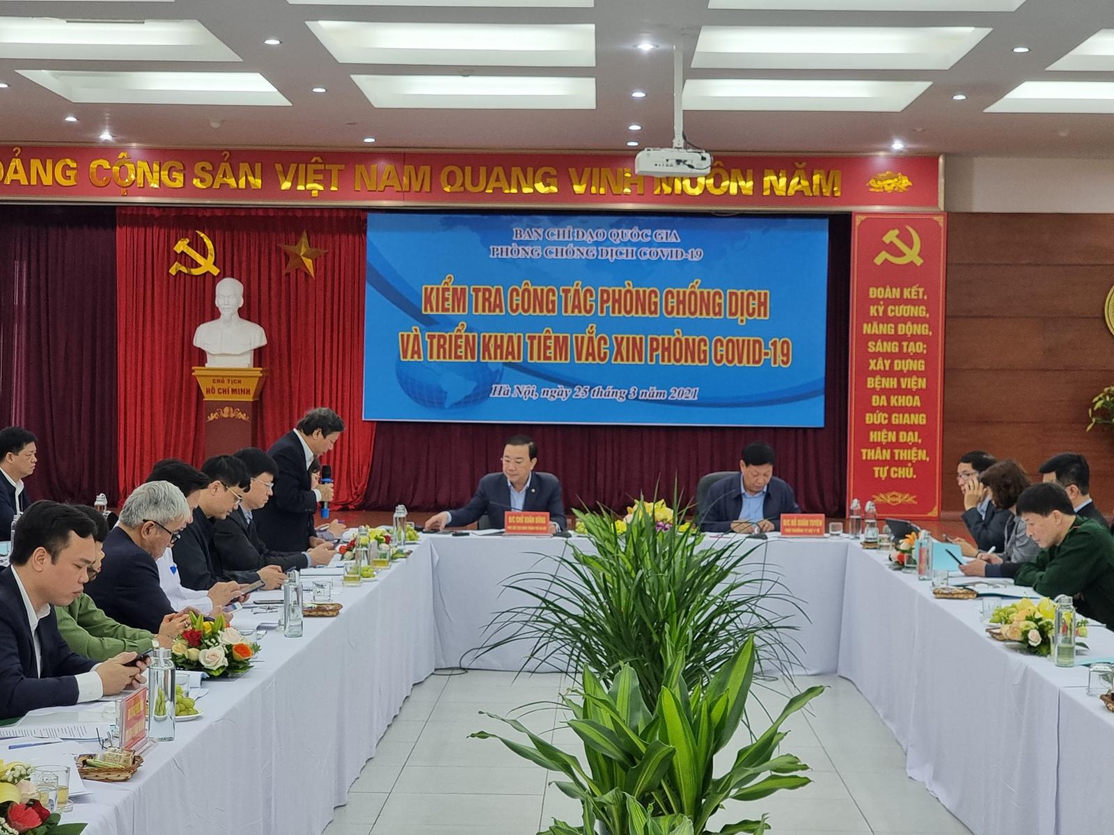 Ngày 25/3, đoàn công tác của Bộ Y tế do Thứ trưởng Bộ Y tế Đỗ Xuân Tuyên làm trưởng đoàn đã đến kiểm tra công tác tiêm vắc xin COVID-19 tại Bệnh viện Đa khoa Đức Giang và làm việc với UBND TP Hà Nội về công tác phòng chống COVID-19 trên địa bàn.