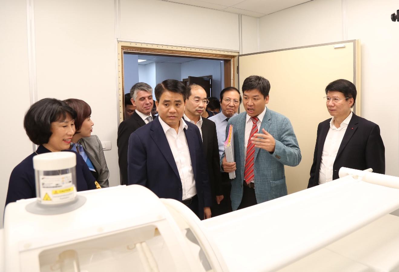 Chủ tịch UBND TP Hà Nội Nguyễn Đức Chung cùng các đại biểu thăm quan hệ thống máy Pyrexar tăng nhiệt hỗ trợ điều trị ung thư. Ảnh: LP