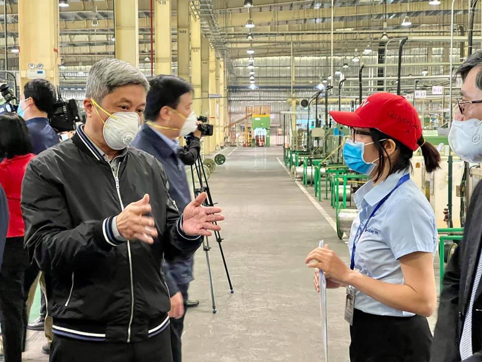 Thứ trưởng Bộ Y tế Nguyễn Trường Sơn kiểm tra công tác phòng, chống dịch COVID-19 tại công ty Hitachi Cable tại huyện Cẩm Giàng, tỉnh Hải Dương. Ảnh: BYT
