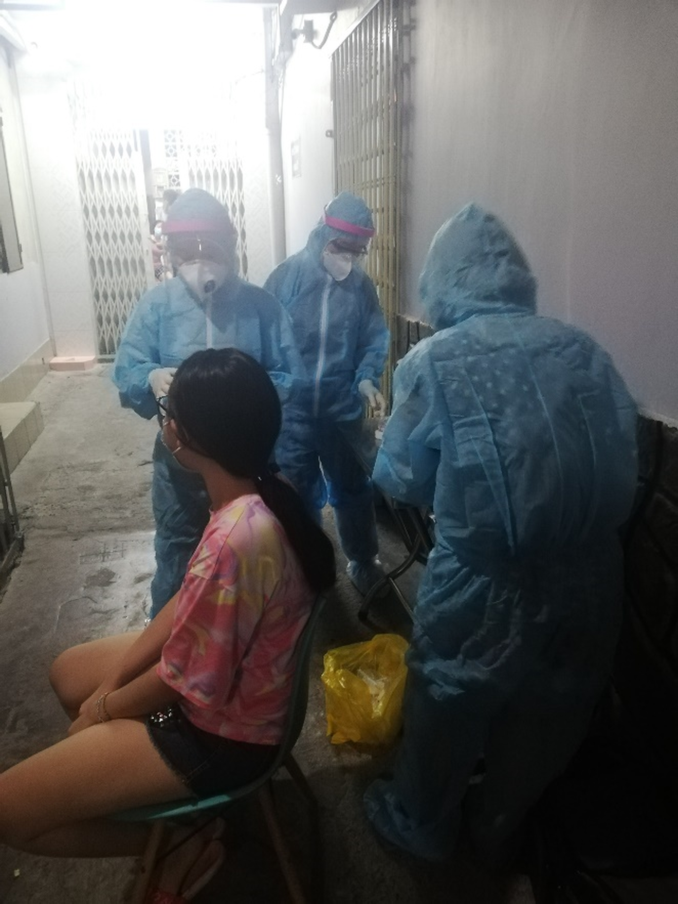 Khử khuẩn và lấy mẫu ngay tại nhà các trường tiếp xúc gần với người sang Campuchia. Ảnh: Trung tâm Y tế quận 11