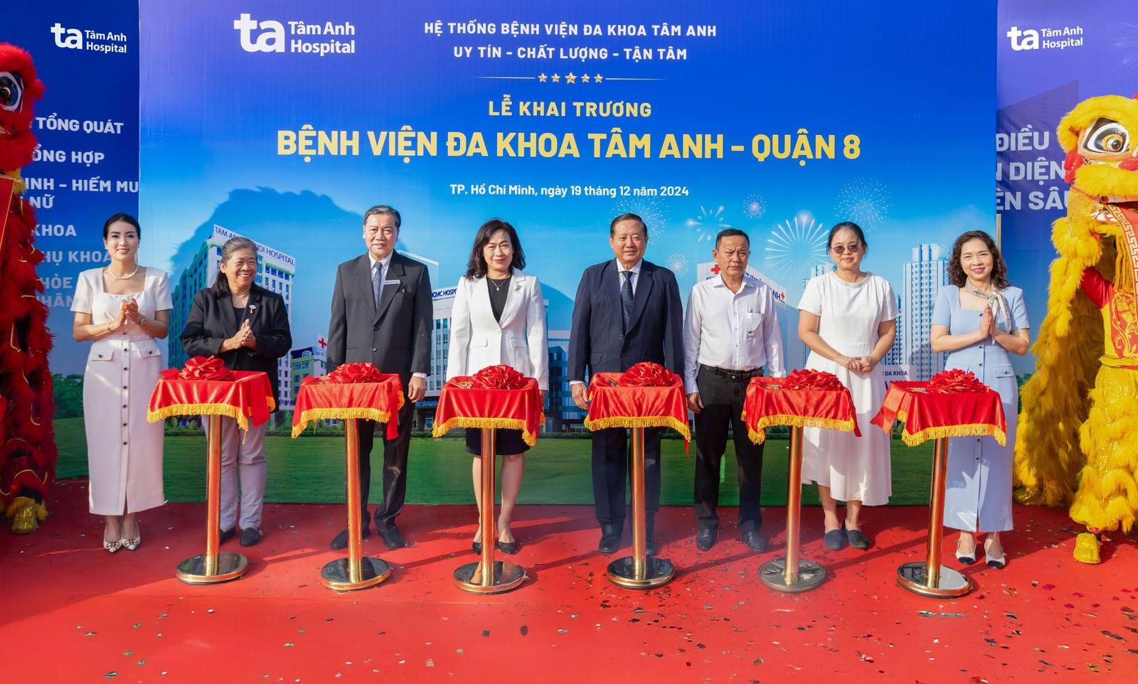 Lãnh đạo Sở Y Tế TP.HCM, UBND Quận 8 TP.HCM và Ban lãnh đạo Hệ thống Bệnh viện Đa khoa Tâm Anh cắt băng khai trương Bệnh viện Đa khoa Tâm Anh - Quận 8. Ảnh: Phan Nhật