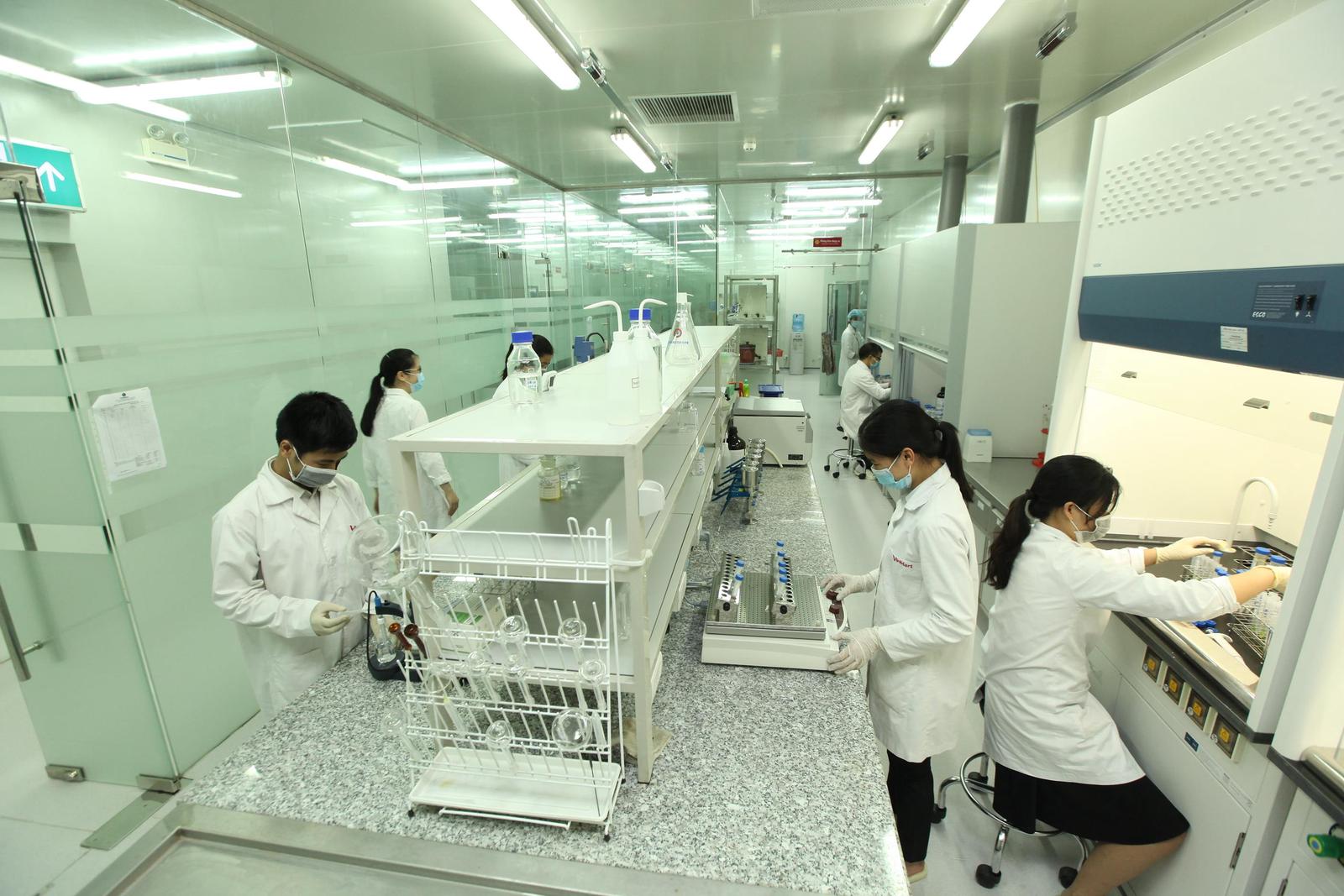 Các kiểm nghiệm viên đang thực hiện công đoạn chuẩn bị mẫu để phân tích trên thiết bị.
