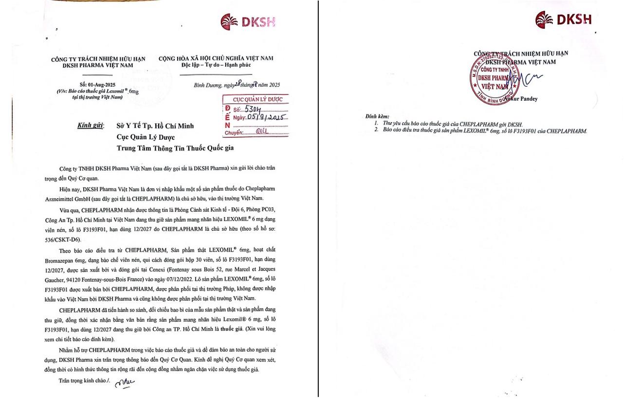 Báo cáo sản phẩm Lexomil® 6mg thuốc giả tại thị trường Việt Nam của Công ty TNHH DKSH Pharma Việt Nam. Ảnh: Cục Quản lý Dược