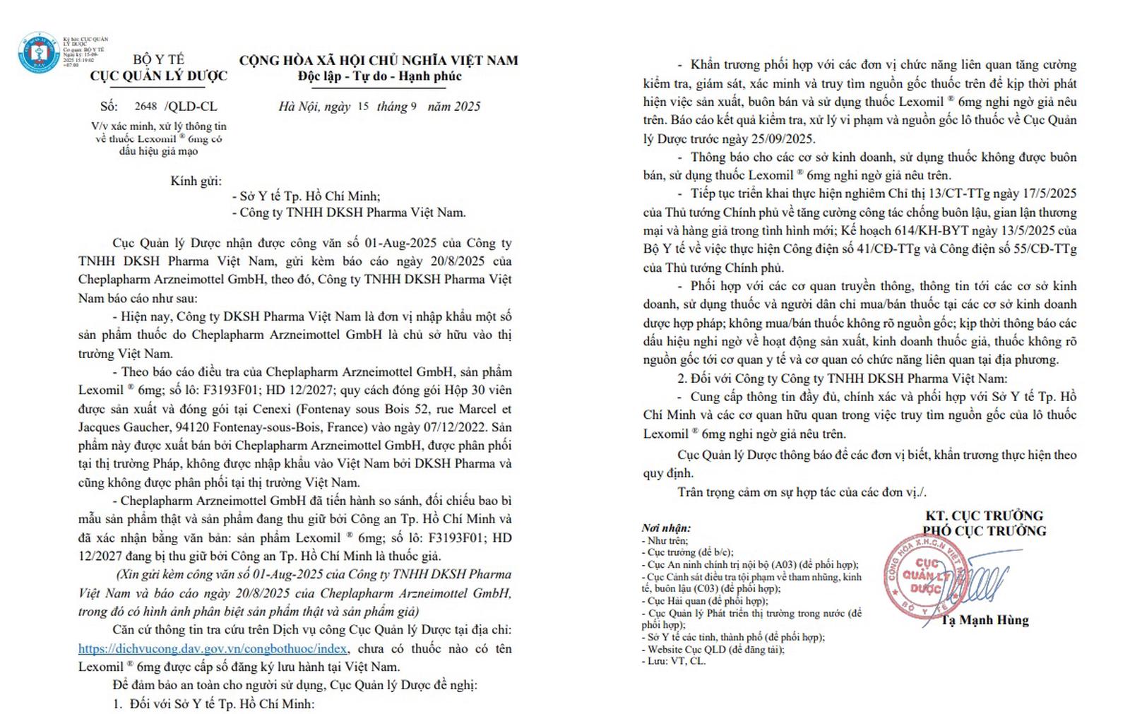 Để đảm bảo an toàn cho người sử dụng, Cục Quản lý Dược đề nghị: Sở Y tế TP Hồ Chí Minh phối hợp các đơn vị liên quan khẩn trương kiểm tra, giám sát, truy tìm nguồn gốc thuốc Lexomil® 6mg giả; báo cáo kết quả trước ngày 25/9/2025.
