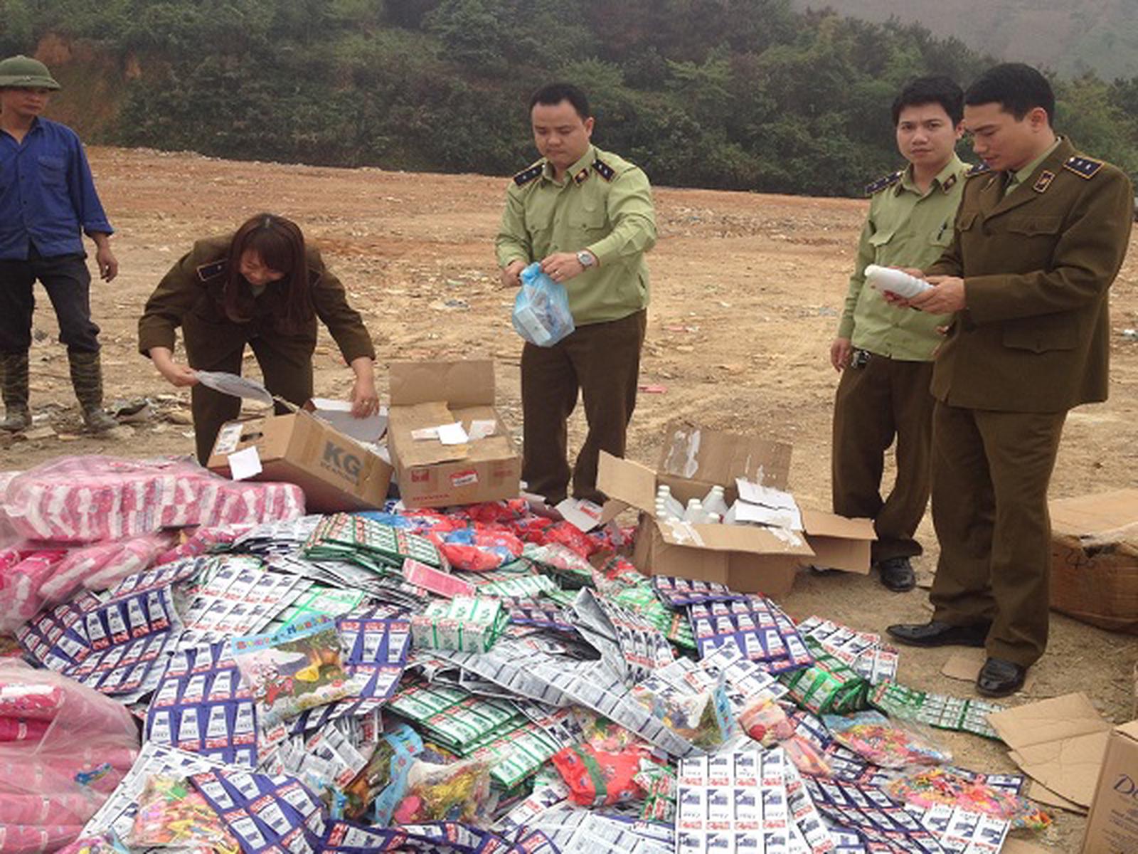 Cục qQuản lý thị trường tỉnh Lào Cai tiêu hủy hàng hóa không rõ nguồn gốc. Ảnh: TQ