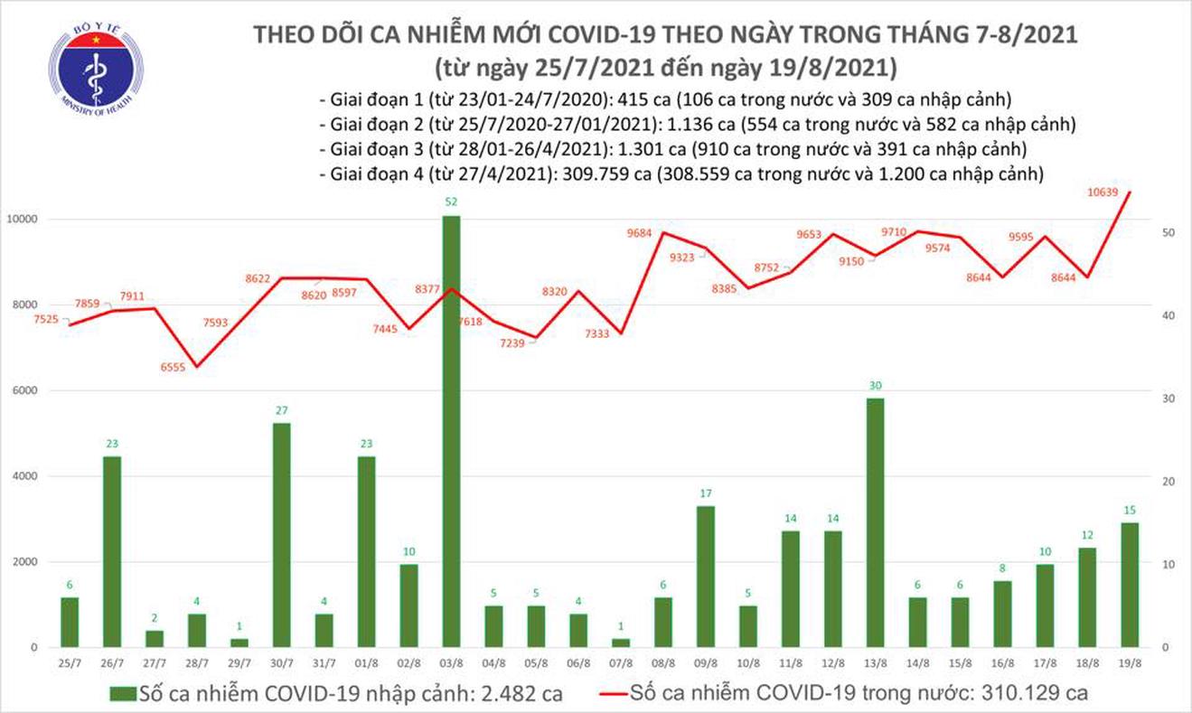 Trong số 10.654 ca nhiễm mới có 15 ca nhập cảnh và 10.639 ca ghi nhận trong nước tại TP. Hồ Chí Minh (4.425), Bình Dương (3.255), Đồng Nai (657), Long An (545), Tiền Giang (478), Đồng Tháp (185), Đà Nẵng (164), Khánh Hòa (151), Cần Thơ (134), Tây Ninh (102), An Giang (70), Vĩnh Long (60), Hà Nội (53), Trà Vinh (51), Nghệ An (45), Phú Yên (44), Bình Thuận (43), Sơn La (26), Quảng Nam (24), Bình Định (24), Kiên Giang (17), Quảng Ngãi (16), Quảng Trị (9), Bình Phước (8 ), Bắc Giang (7), Ninh Thuận (7), Hà Tĩnh (7), Hậu Giang (6), Thanh Hóa (6), Bắc Ninh (4), Nam Định (4), Quảng Bình (4), Hải Dương (2), Ninh Bình (2), Bạc Liêu (2), Thái Bình (1), Lạng Sơn (1) trong đó có 6.407 ca trong cộng đồng.