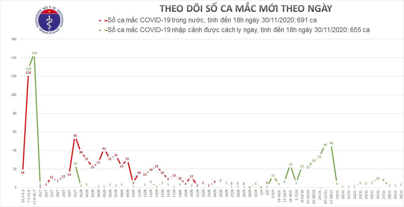 Như vậy, đến 18 giờ ngày 30/11, Việt Nam có tổng cộng 1.346 ca mắc COVID-19, trong đó 691 ca mắc COVID-19 do lây nhiễm trong nước.