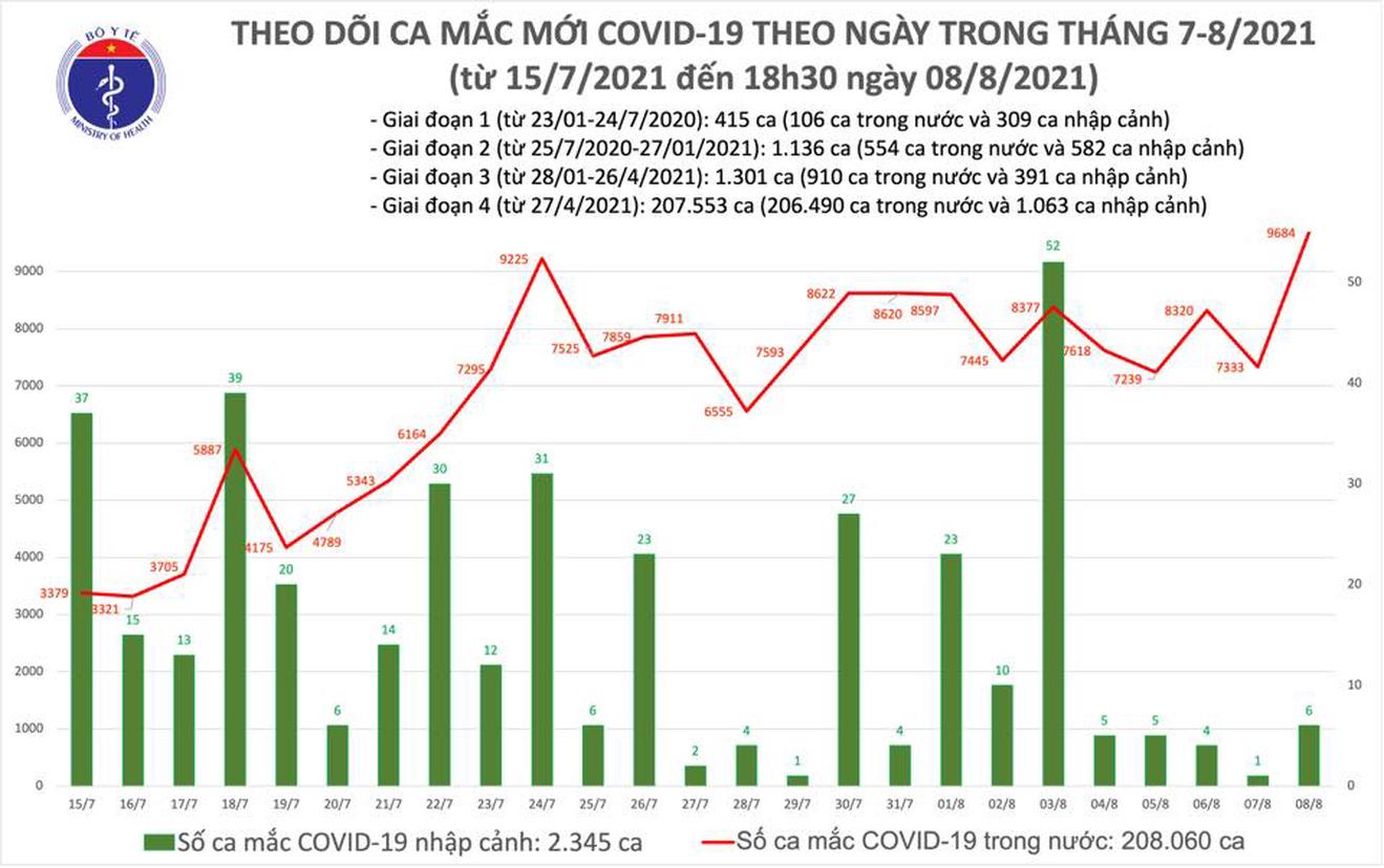 Tổng hợp trong ngày 8/8, cả nước ghi nhận 9.690 ca nhiễm mới, trong đó 06 ca nhập cảnh và 9.684 ca ghi nhận trong nước. Riêng TP. Hồ Chí Minh có 3.898 ca, Bình Dương 3.210 ca.