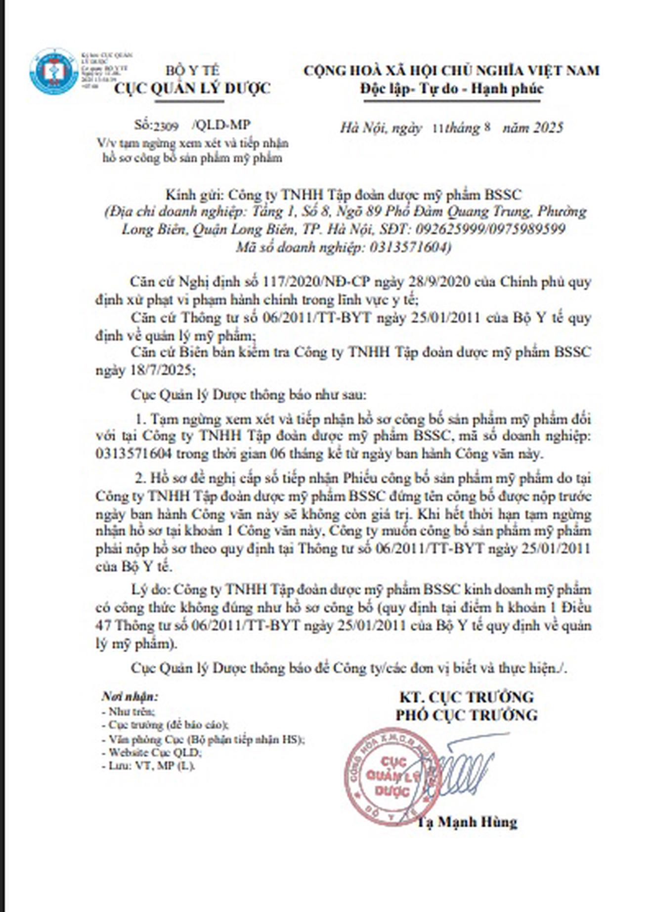Công văn tạm ngừng xem xét và tiếp nhận hồ sơ công bố sản phẩm mỹ phẩm đối với Công ty TNHH Tập đoàn Dược mỹ phẩm BSSC. Ảnh: Cục Quản lý Dược