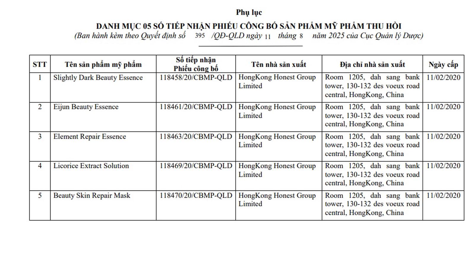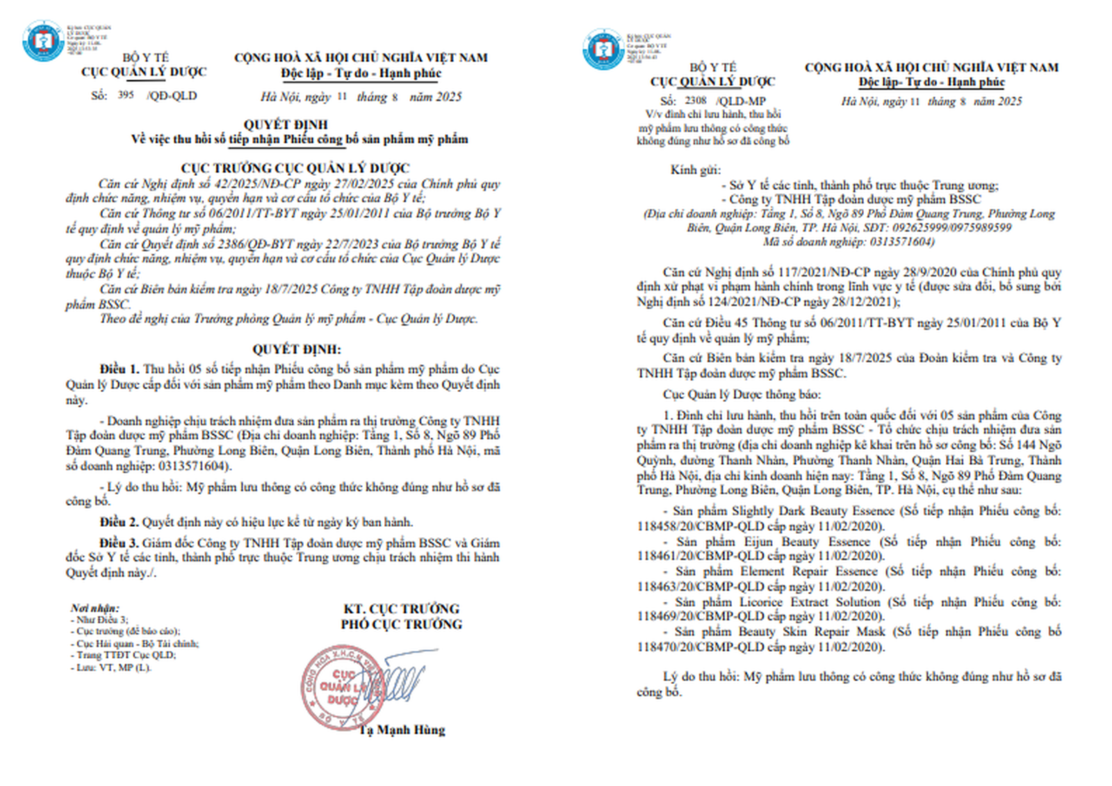 Cùng ngày, Cục Quản lý Dược cũng đã ra Quyết định về việc thu 5 số tiếp nhận Phiếu công bố sản phẩm mỹ phẩm do Cục Quản lý Dược cấp đối với sản phẩm mỹ phẩm do Công ty TNHH Tập đoàn Dược mỹ phẩm BSSC chịu trách nhiệm đưa sản phẩm ra thị trường gồm: