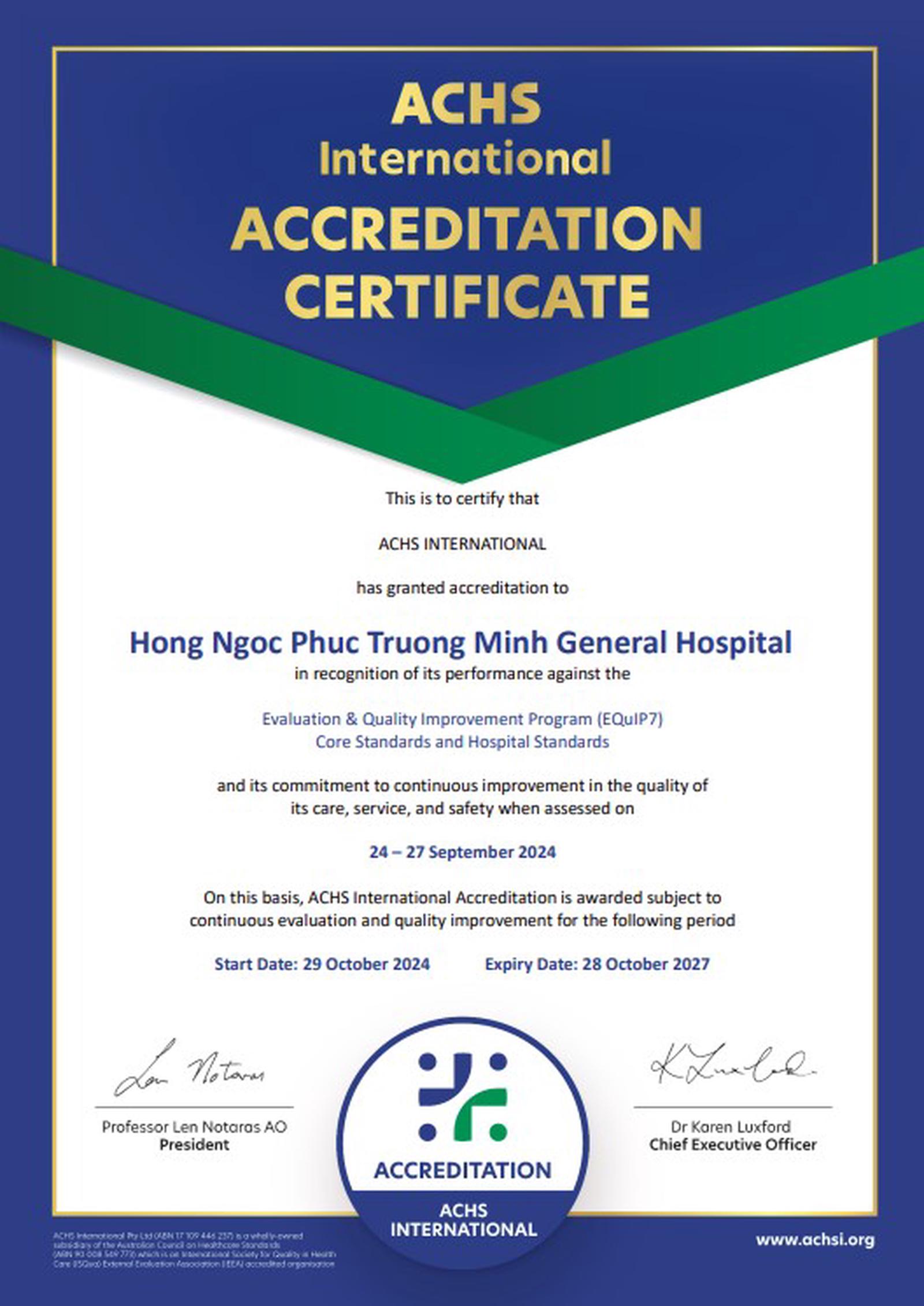 (*) ACHSI (The Australian Council on Healthcare Standards) là chứng chỉ uy tín được công nhận trên toàn cầu, đánh giá chất lượng bệnh viện dựa trên các tiêu chuẩn nghiêm ngặt về an toàn người bệnh, quy trình kiểm soát nhiễm khuẩn và hiệu quả điều trị. Để đạt được chứng chỉ này, đơn vị y tế phải đáp ứng hàng loạt tiêu chí khắt khe, đảm bảo chất lượng dịch vụ ở mức cao nhất.