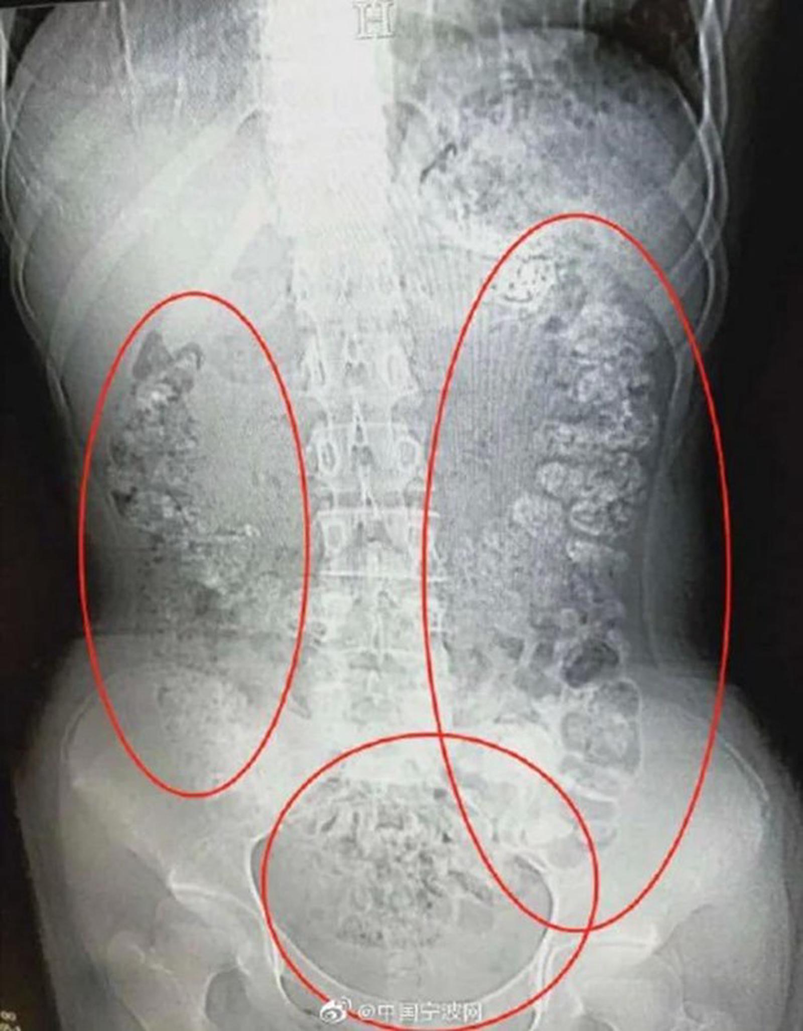 Phát hiện bụng cô bé phình to bất thường, các bác sỹ đã quyết định đưa bệnh nhân này đi chụp cắt lớp. Kết quả chụp cắt lớp cho thấy hàng trăm vật thể nhỏ hình tròn nằm trong khắp các cơ quan nội tạng, từ dạ dày, đại tràng, ruột và hậu môn.
