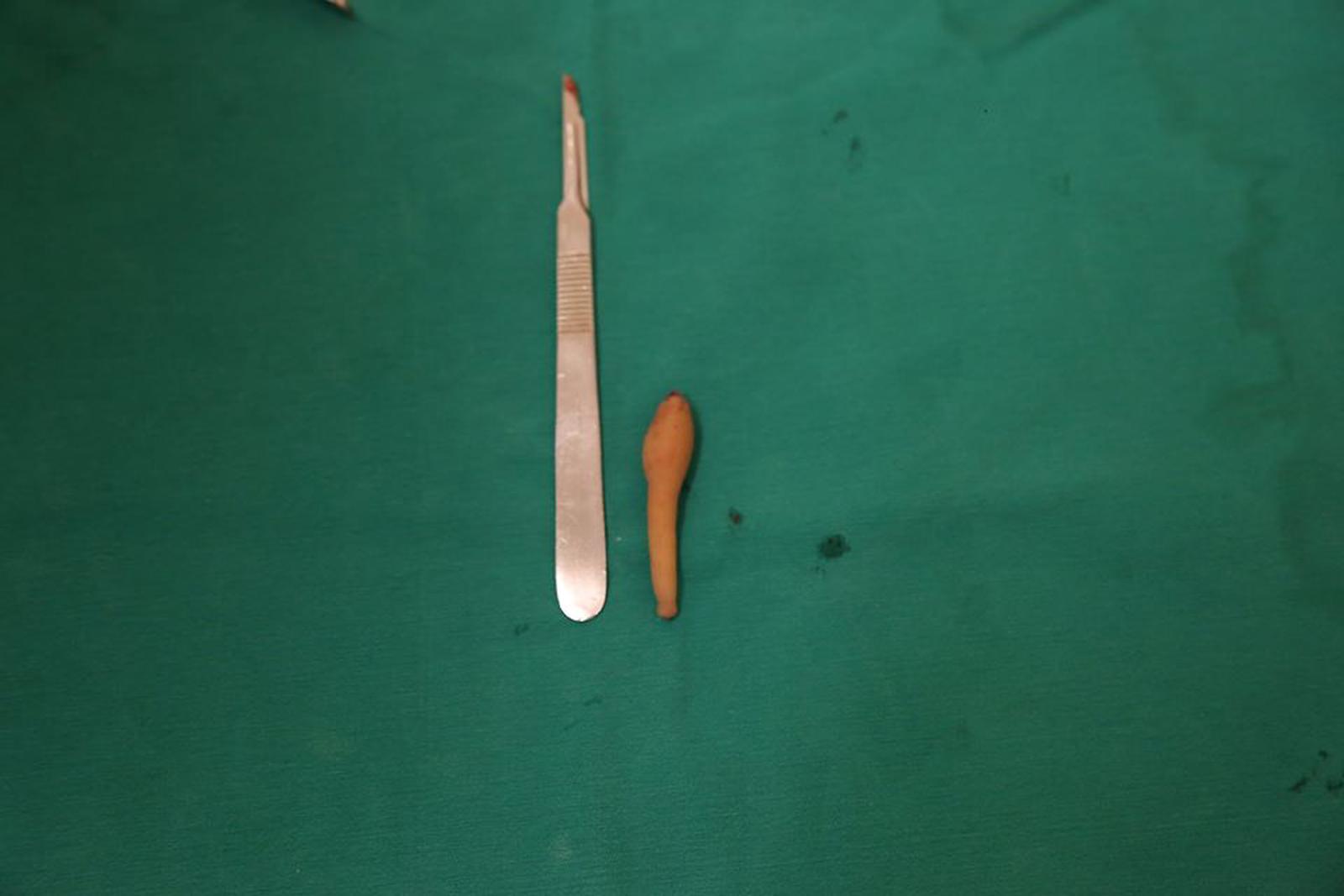 Qua theo dõi, bệnh nhi còn đuôi vùng cùng cụt, kích thước đuôi bình thường 5cm, kéo dài là 9,5cm, đường kính vùng lớn nhất 4cm. Đuôi ấn mềm, không đau, đuôi không vận động được. Đuôi lớn dần theo tuổi của bé, các cơ quan bộ phận khác chưa phát hiện gì đặc biệt. Qua chụp X-quang không thấy hình ảnh xương vùng đuôi. Các bác sĩ chẩn đoán bệnh nhân có dị tật còn đuôi bẩm sinh. Có chỉ định phẫu thuật cắt bỏ hoàn toàn vùng đuôi.