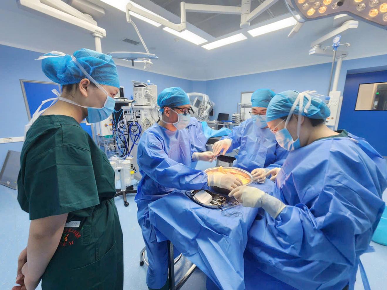 Thầy thuốc ưu tú, bác sĩ CKII Phạm Việt Hùng, Trưởng khoa Ngoại, Bệnh viện Đa khoa tỉnh (thứ 2, trái sang) tham gia vào quá trình rửa và ghép tạng tại Bệnh viện số 2, Đại học Y Quảng Tây (Trung Quốc). Ảnh: TTTT