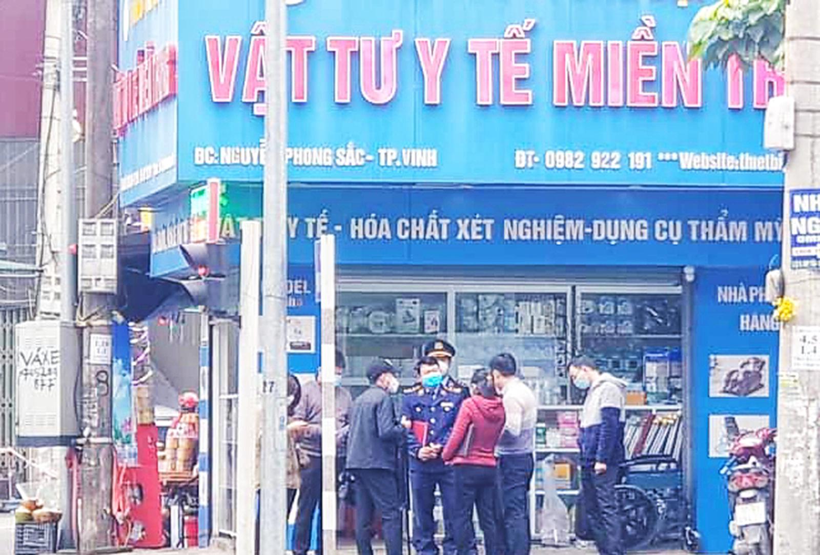 Điển hình, ngày 14/2/2022, đoàn kiểm tra của Sở Y tế phối hợp cùng lực lượng quản lý thị trường (QLTT) tỉnh tiến hành kiểm tra cửa hàng kinh doanh thiết bị y tế của một đại lý trên đường Nguyễn Phong Sắc, TP Vinh. Cửa hàng này kinh doanh theo giấy phép với các ngành nghề: Thiết bị vật tư y tế, bảo hộ lao động, hóa chất công nghiệp, dịch vụ phun thuốc công nghiệp. Đây là các mặt hàng kinh doanh thiết bị vật tư y tế, hóa chất công nghiệp thuộc nhóm ngành nghề kinh doanh có điều kiện.