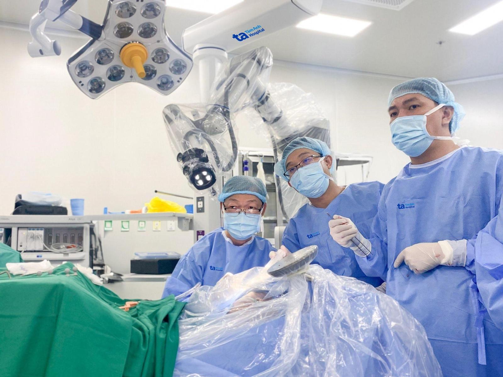Bác sĩ Chu Tấn Sĩ và ê kip thực hiện phẫu thuật cho người bệnh bằng Robot AI. Ảnh: Bệnh viện Đa khoa Tâm Anh TP.HCM.